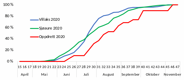Registreringa gjennom 8-års perioden 2013-2020 har vist stor mellomårsvariasjon i oppvandringsforløpet for villaksen og for oppdrettslaksen. Innafor same år kan det vera stor skilnad mellom vill og rømt laks, der tidspunkt for 50 % oppvandring for rømlingane einskilde år kan vera nokre veker seinare enn villaksen, medan dei andre år vandrar opp synkront. I 2020 var 50 % av villaksen registrert i veke 29 (veke 30 i 2019, veke 31 i 2018 og veke 26 i 2017), medan 50 % av den rømte oppdrettslaksen var registrert fire veker seinare enn villaksen i 2020 og tre veker seinare enn villaksen i 2019.