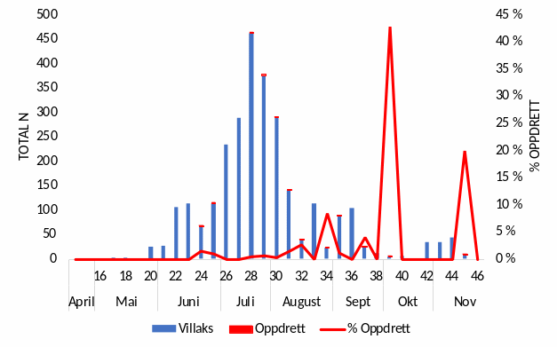 Mengda og prosentdel av rømt fisk som vandrar opp i ei elv kan variera mykje gjennom oppvandringsperioden (Fig. 7). I dei fleste vassdrag der ein registrerer rømt fisk i sportsfisket, haustfisket eller i stamfisket, får ein ikkje registrert gjennom heile oppvandringa, men får eit avgrensa uttak som gir eit estimat for prosentvis innslag av rømlingar i bestanden. I drivteljingar får ein betre oversikt over totalt antal fisk, men vanskar med visuell klassifisering tilseier at drivteljingane kan underestimera antal rømt oppdrettsfisk.