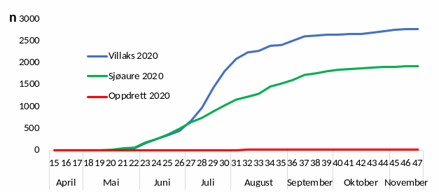 Andel rømt laks vart i 2020 redusert fra 0.7% til 0,1%, mot tilsvarande frå 4,1% til <0,3% i 2019.