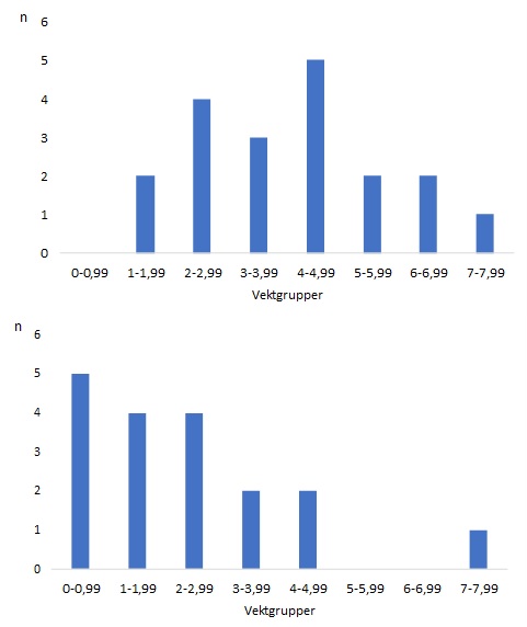 For rømlingane som var registrerte i fella i 2020, varierte storleiken frå 1,7 til 7,2 kg mot 0,8 til 7,7 kg i 2019. Vektfordelinga i 2020 viste to toppar, den eine i gruppa 2-3 kg og den andre i gruppa 4-5 kg (Fig. 5). Skjellkontrollen stadfesta oppdrettsbakgrunn til alle rømlingane. Av dei 2772 individa som var klassifisert fenotypisk som villaks, vart eit tilfeldig utval på 25% av individa kontrollerte. Eitt individ vart reklassifisert som rømling (0,14 %).