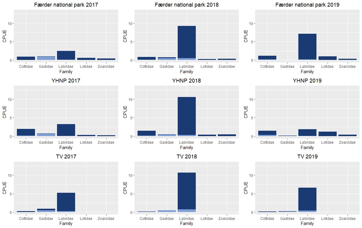 Figur 2.1.1 Fiskesamfunnet i ytre Oslofjord sammenlignet med tilsvarende undersøkelser i Tvedestrand (modifisert fra Synnes 2020). Fangst-per-enhet-innsasts (CPUE) av tallmessig dominerende fiskefamilier (ulker = Cottidae; torskefisker = Gadidae; leppefisk = Labridae; brosmefamilien = Lotidae; ålekvabbefamilien = Zoarchidae) samplet med ruser og fisketeiner (mai 2017, 2018 og 2019) i Færder- og Ytre Hvaler nasjonalparker og tilstøtende områder. Mørk blå = adulte stadier, lys blå = juvenile stadier. Høy temperatur i 2018 bidro til høy fangbarhet for leppefiskartene bergnebb (C. rupestris) og grønngylt (S. melops).
