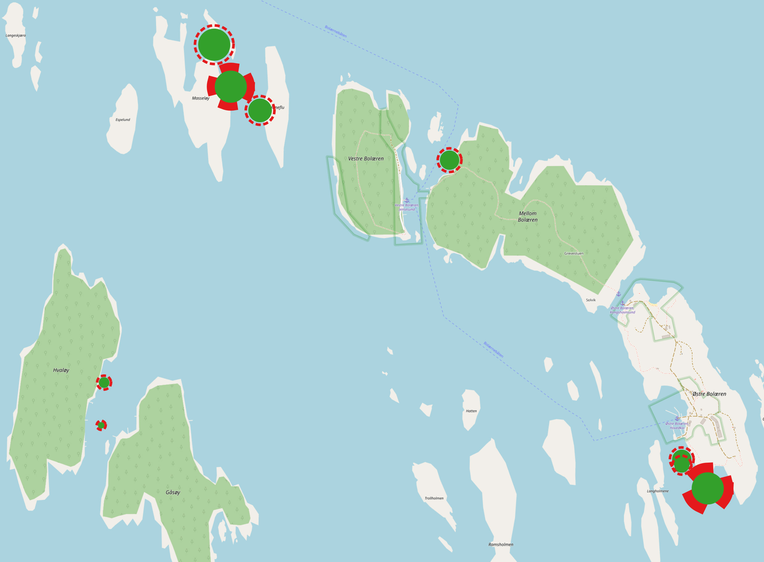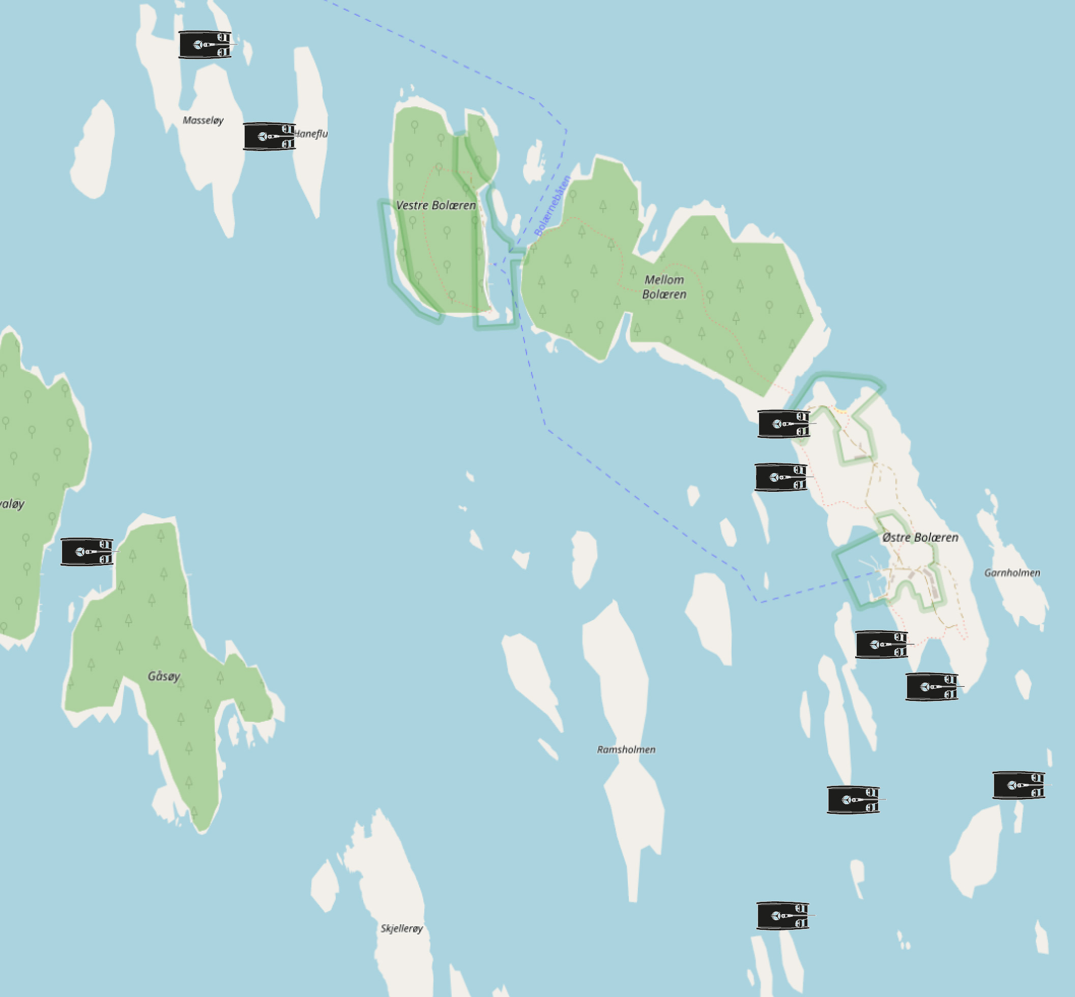 I november 2019 ble fem steinkobber fanget og merket ved Bolærne i Færder nasjonalpark. Disse dyrene besto av tre hanner og to hunner, som veide mellom 40 og 56 kg (Tabell 2.3.2.1). Merkene samlet GPS-posisjoner, dykkeprofiler og vanntemperatur mellom november 2019 og mars 2020. Foreløpige resultater viser at steinkobber i ytre Oslofjord er mer mobile enn tidligere antatt. Individer merket ved Bolærne har beveget seg hyppig mellom områder i Færder nasjonalpark, Ytre Hvaler nasjonalpark, samt Kosterhavet nasjonalpark og Väderöarna i Sverige (Fig. 2.3.2.2). Dette er svært relevant informasjon siden steinkobber forvaltes fylkesvis i Norge. Dessuten er steinkobbe i Norge og Sverige forvaltet som forskjellige bestander. Høy mobilitet hos steinkobber, som merkede individer viser, er en sannsynlig forklaring på at det i perioder kan gis et inntrykk av at det er flere steinkobber enn hva tellinger viser i farvannene i ytre Oslofjord.