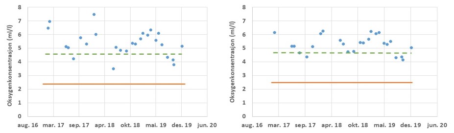 Nedre voksegrense for ålegras kan gi informasjon om vannkvaliteten (lysforholdene) og endringer i disse. I 2018 ble nedre voksegrense fysisk avmerket med pinner i seks ålegressenger. Dette for å kunne følge år til år variasjon i dybdeutbredelse. Slike variasjoner kan oppstå ved f.eks. endrede lysforhold som følge av eutrofiering eller avrenning av partikler fra land. I 2019 ble 5 av stasjonene gjenbesøkt - to ytre, og 3 indre (som er mest påvirket av slike endringer). 17 av 25 pinner ble gjenfunnet (Fig. 2.3.4.2), og det ble ikke funnet noen endring i nedre utbredelse av ålegresset (usikkerhet på ± 5cm).