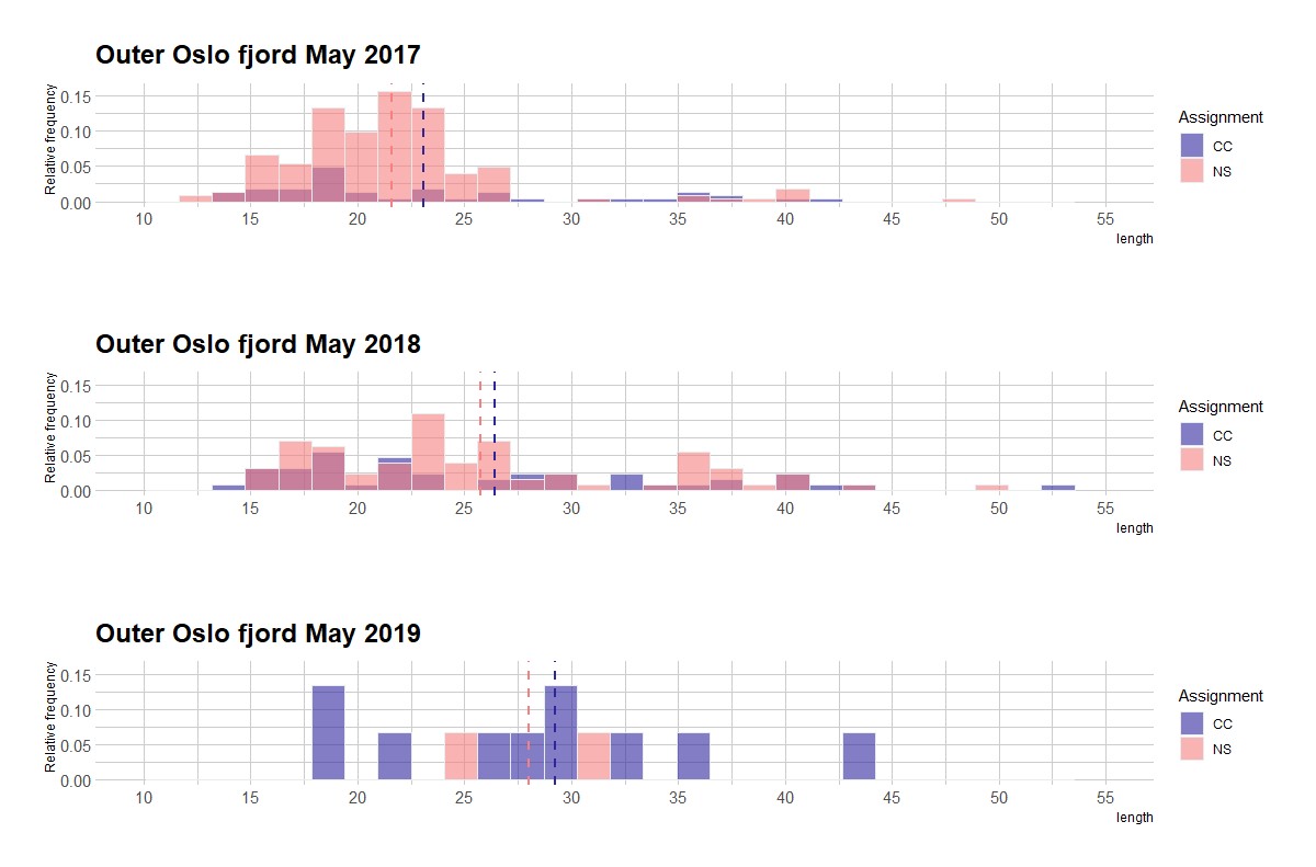 Figur 2.2.1 Lengdefordeling til torsk fanget i ruser og teiner under toktene gjennomført i mai 2017-2019. Blå = «fjord»-økotype», rosa = «Nordsjø»-økotype. Lilla = overlapp i lengdegruppe mellom de to økotypene. Svært få individer over minstemålet for torsk (>40 cm, eldre enn ca. 2 år) ble observert i alle redskapstyper i løpet av prosjektperioden (modifisert fra Synnes 2020).