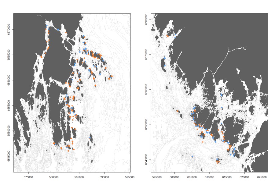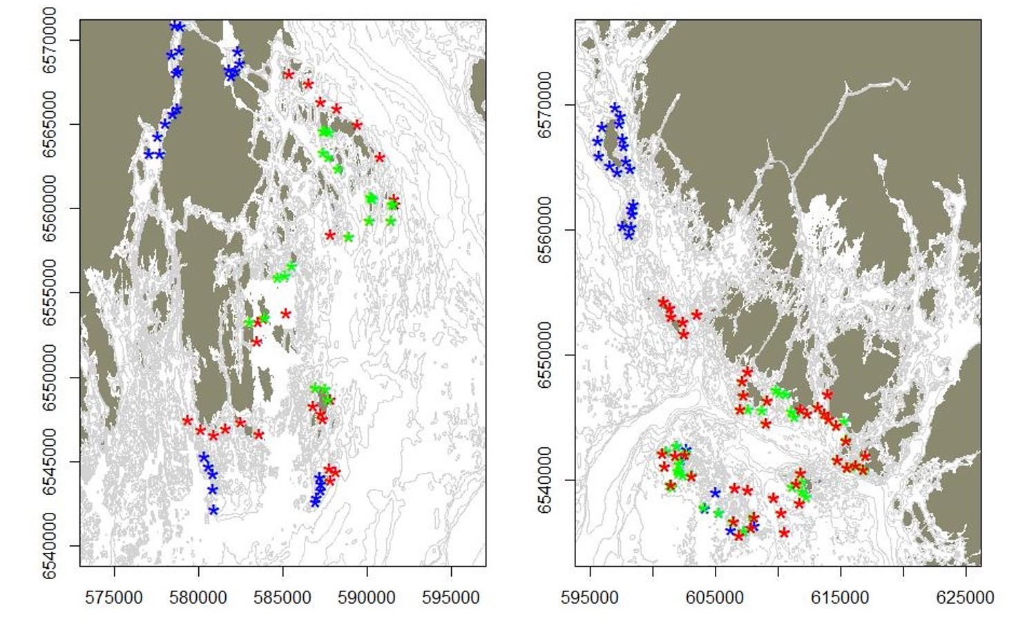 Figur 2.2.2 Økotype til torsk fanget i ruser og teiner i Færder- (venstre panel) og Ytre Hvaler (høyre panel) nasjonalparker under Havforskningsinstituttets tokt i mai 2017, 2018 og 2019. Røde symboler indikerer individer med økotype «Nordsjø», og blå symboler indikerer individer med økotype «fjord» basert på populasjonsgenetiske analyser.