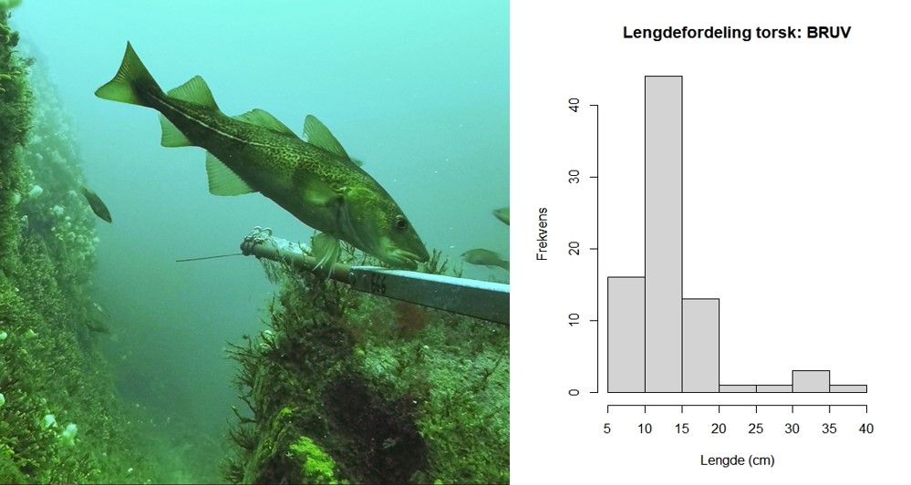 Figur 2.2.3 Venstre: eldre torsk (47 cm) ved Tjømebåen, august 2018 (22 m dyp). Høyre panel: lengdefordeling av torsk fra alle stereovideostasjoner i ytre Oslofjord august 2019. Fordelingen viser tydelig dominans av 2019-årsklassen («0-gruppe»), med individer fra 5-15 cm lengde. Lengdegrupper 15-30 cm antas å være 1-åringer (2018-årsklassen), lengdegrupper 30-40 cm antas å være 2-åringer (2017-årsklassen). Ingen torsk over minstemål i fritidsfisket (40 cm) ble observert med stereovideo i ytre Oslofjord i august 2019. Foto: E. Moland/ Havforskningsinstituttet.