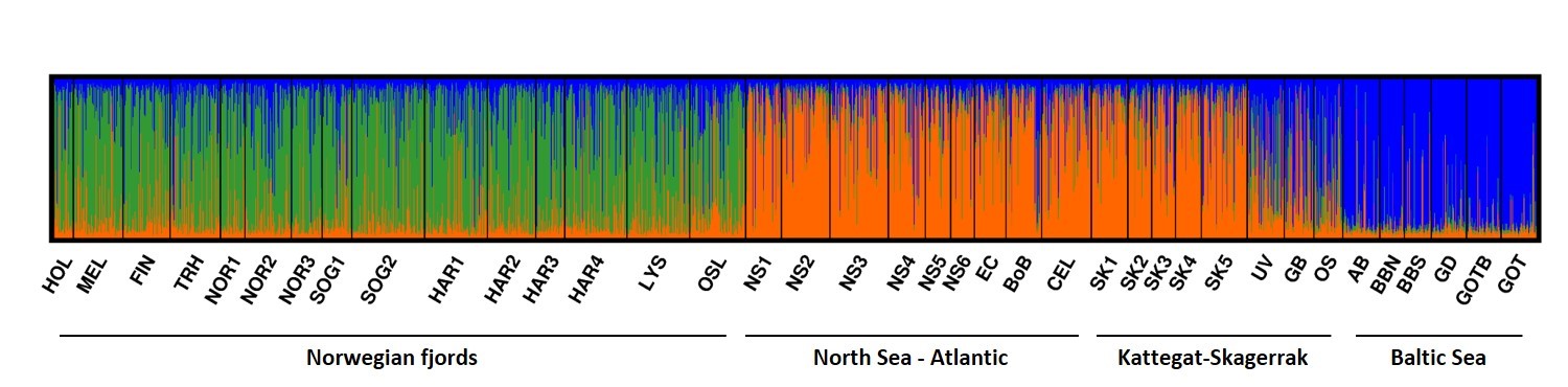 Havforskningsinstituttet har i prosjektperioden hatt et gjennombrudd i genetisk kartlegging av brisling og beskrivelse av populasjonsstruktur hos brisling (Quintela m.fl. 2020). Hovedfunnet i dette arbeidet, for Oslofjordens vedkommende, er at brisling funnet her er genetisk forskjellig fra brisling i Skagerrak og Kattegat (Fig. 2.3.1.1). En revidert forvaltning av brisling må gå utfra at fjordbestanden er stedegen og derfor sårbar. Gjenoppbygging av denne lokale bestanden vil måtte baseres på lavere uttak i fisket etter brisling og begrensing av fiskedødelighet i selve fjordsystemet.