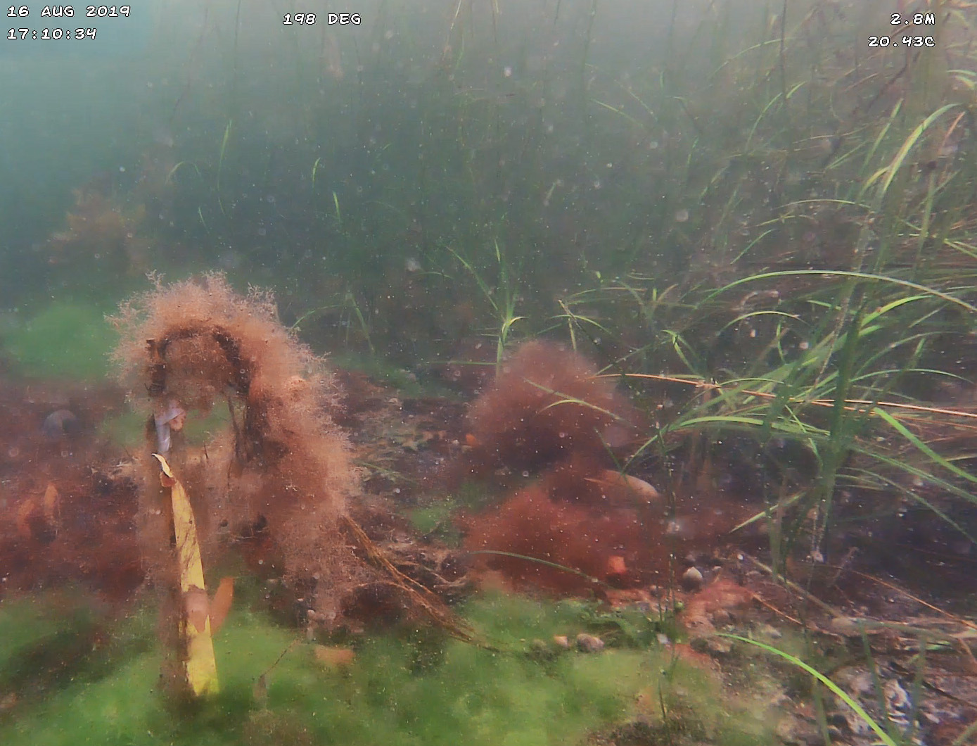 Figur 2.3.4.2 Markeringspinner for nedre voksegrense for ålegras, ett år etter markering. Foto: J. Thormar/ Havforskningsinstituttet.