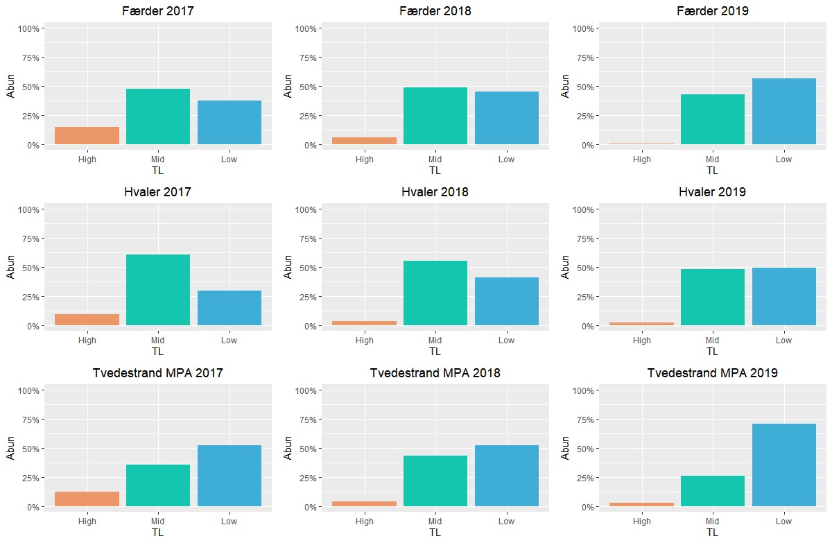 Figur 2.1.2 Fiskesamfunnet i ytre Oslofjord sammenlignet med tilsvarende undersøkelser i Tvedestrand (modifisert fra Synnes 2020). Tetthet (i %) av fiskearter samplet med ruser og fisketeiner (i mai 2017, 2018 og 2019) i Færder- og Ytre Hvaler nasjonalparker og tilstøtende områder, karakterisert i henhold til tre trofiske nivåer: «høyt» (= fiskespisende toppredatorer, oransje); «middels» (= beitere på større evertebrater, grønn); og «lav» (= beitere på mindre evertebrater, blå).