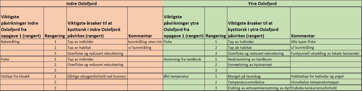 Deler av Oslofjorden har til dels store miljøutfordringer med hensyn på avrenning, næringssaltbelastning og oksygenforhold i bunnvannet. Viktige habitater er svekket gjennom utbredt og langvarig bunntråling, endret lysgjennomtrenging ned i vannmassene og temperaturøkning. Samtidig er det ikke grunn til å hevde at det ikke lenger finnes livsgrunnlag for torsk og andre sterkt reduserte fiskebestander i ytre Oslofjord. Beste tilgjengelige kunnskap tilsier at lokal bestandsdynamikk er et fremtredende mønster.