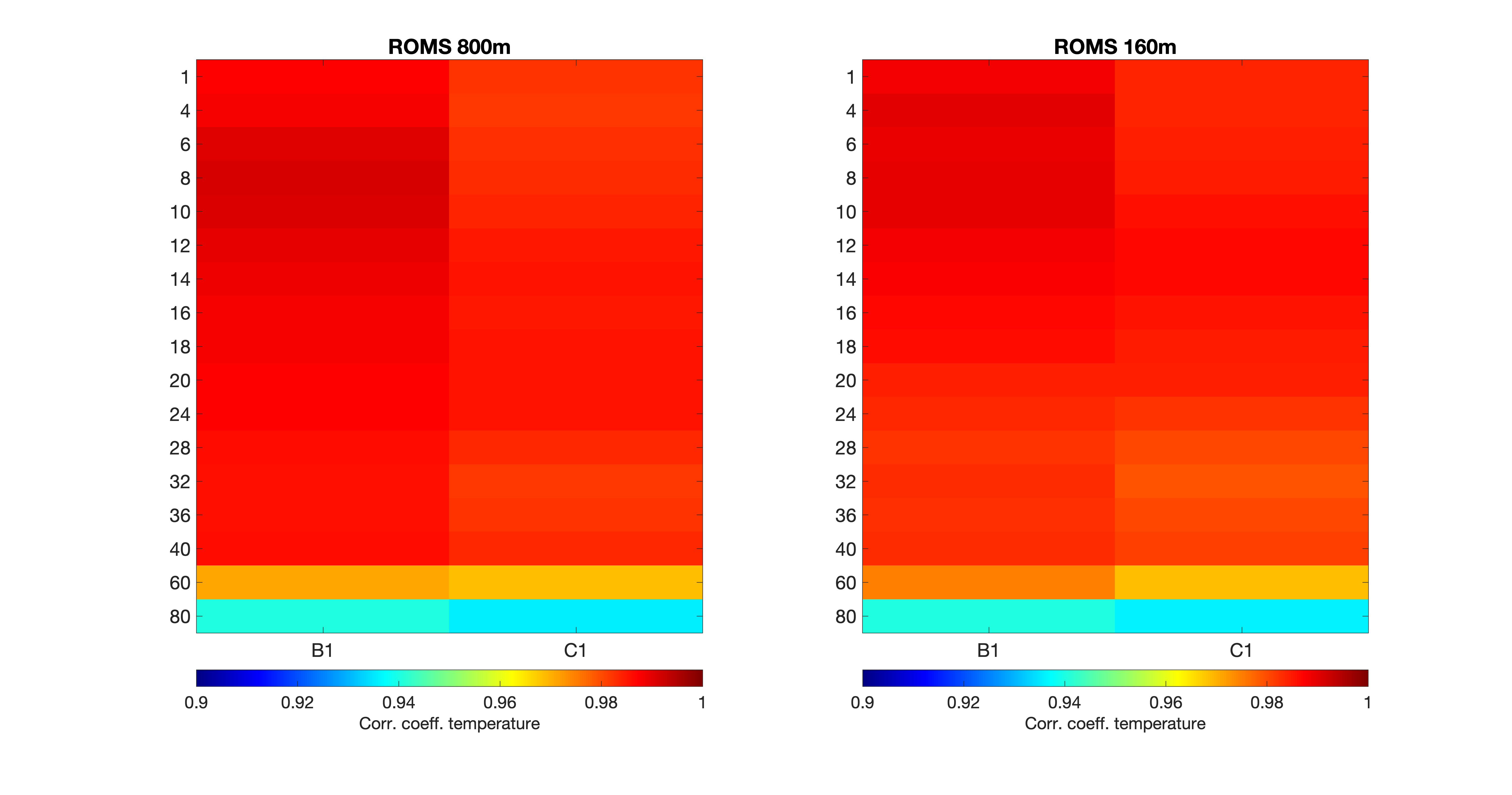 Ved å standardisere den langtids-midlete modellfeilen, får man frem modellens bias i forhold til variabiliteten. Generelt ser man at både NK800 og A160 har kun små feil i både saltholdighet og temperatur, men at begge modellene har litt for lav saltholdighet under rundt 20m og litt for lav temperatur i de øvre 20m. Ved å se på korrelasjonsfaktorene i Figur10, så ser man at disse er veldig like for både NK800 og A160 og at verdiene er svært høye for de øvre 40m. Overflatesaltholdigheten har noe lavere korrelasjon, men dette skyldes at variabiliteten er høy og at ferskvannsavrenning og ytre påvirkninger kan gi betydelige endringer som ikke nødvendigvis gjenskapes til rett tid i modellen.
