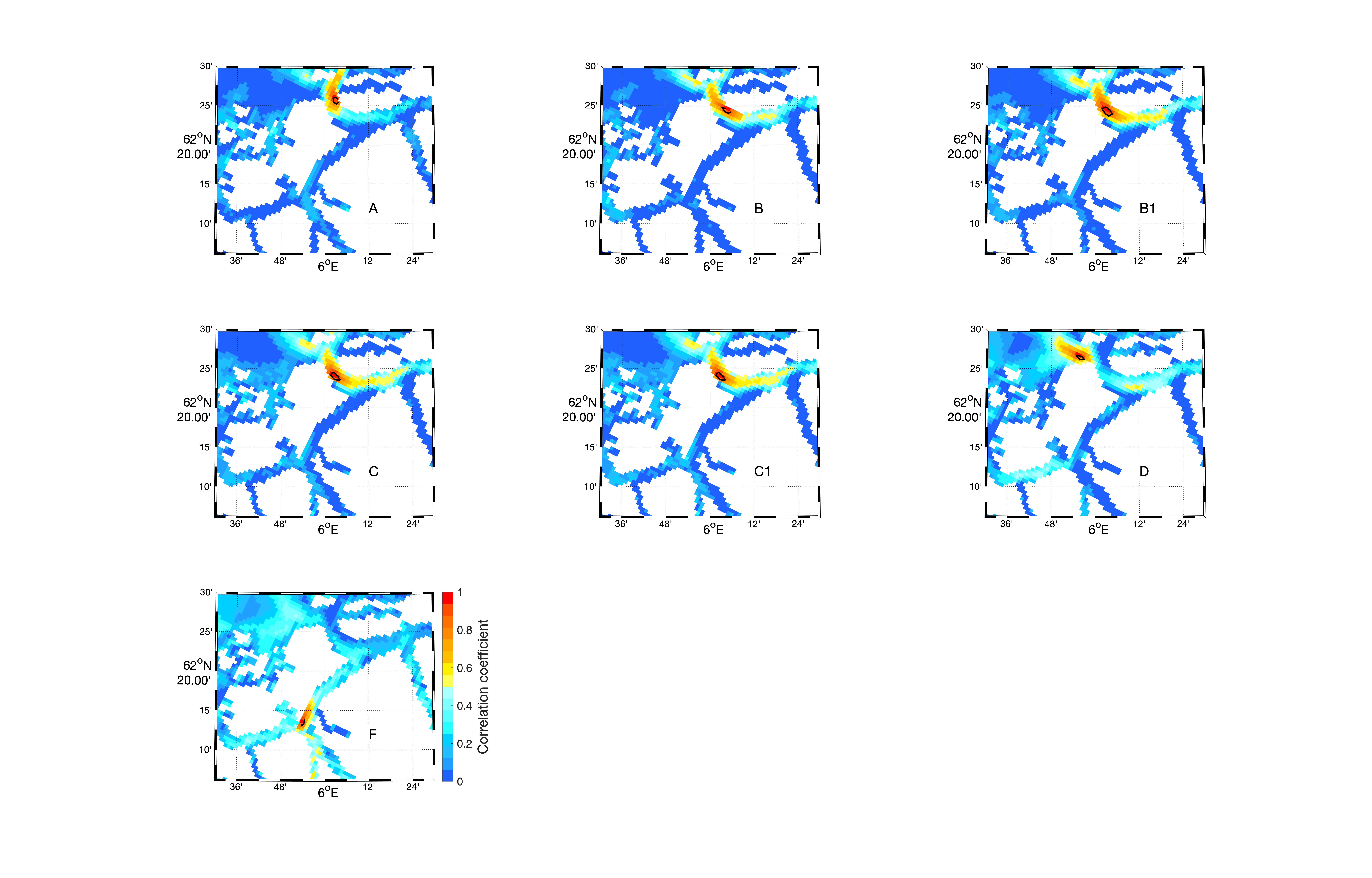 Figur 13. Korrelasjonskoeffisient i strømstyrke i overflaten fra NK800 mellom bøyelokalitetene (navn på bøye angitt med bokstav inne på land) og resten av det modellerte strømfeltet. Fargene angir styrken på korrelasjonskoeffisienten og sort linje indikerer grensen for verdi på 0,9.Figur 14. Som Figur 13, men her fra A160. Merk at kartutsnittene er skjært ut av det originale modellfeltet i vest og nord.