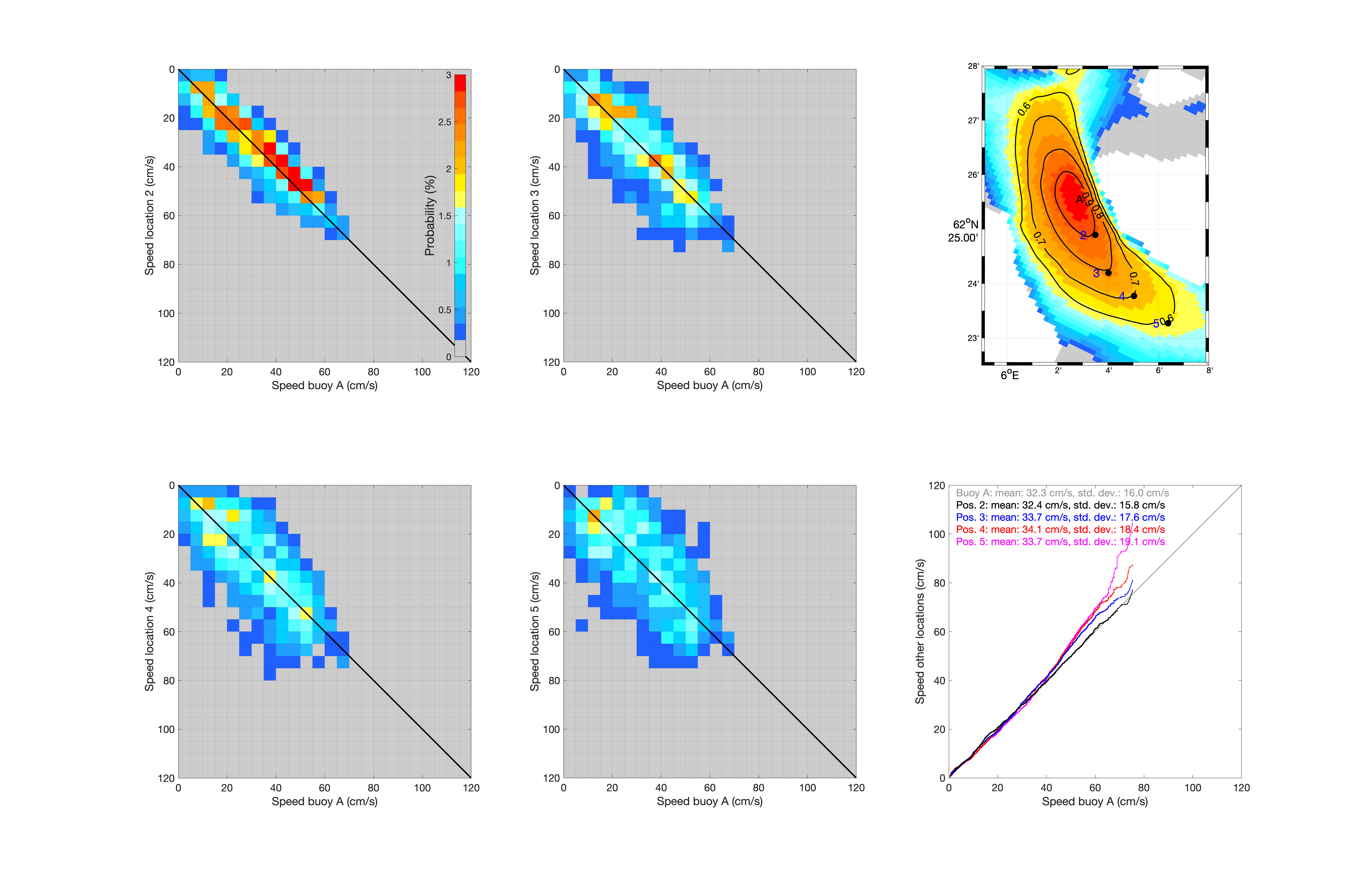 Figur 15. Kartet oppe til høyre viser korrelasjonen i overflatestrømstyrke angitt med farger mellom posisjonen til bøye A nordvest i Sulafjorden og alle omkringliggende gridpunkter i A160-modellen. De sorte konturlinjene markerer grensene for korrelasjonskoeffisient på hhv. 0,9, 0,8, 0,7 og 0,6, og de sorte prikkene med tilhørende blå tall markerer eksempelposisjonene som er brukt til å sammenlikne overflatestrøm mot midtpunktet (A). De fire panelene til venstre viser spredningsplott (sortert i bins) mellom strømstyrke (1m) i posisjonen til bøye A og de fire punktene angitt som sorte prikker og blå tall i kartet, hhv. med korrelasjonskoeffisient på 0,9, 0,8, 0,7 og 0,6. Fargene angir her sannsynlighet i % og fargeskalaen går fra 0% (grå) til 3% (rød) i alle fire panelene. De samme strømstyrkeverdiene er rangert fra lavest til høyest og presentert nede til høyre i et qq-plott.