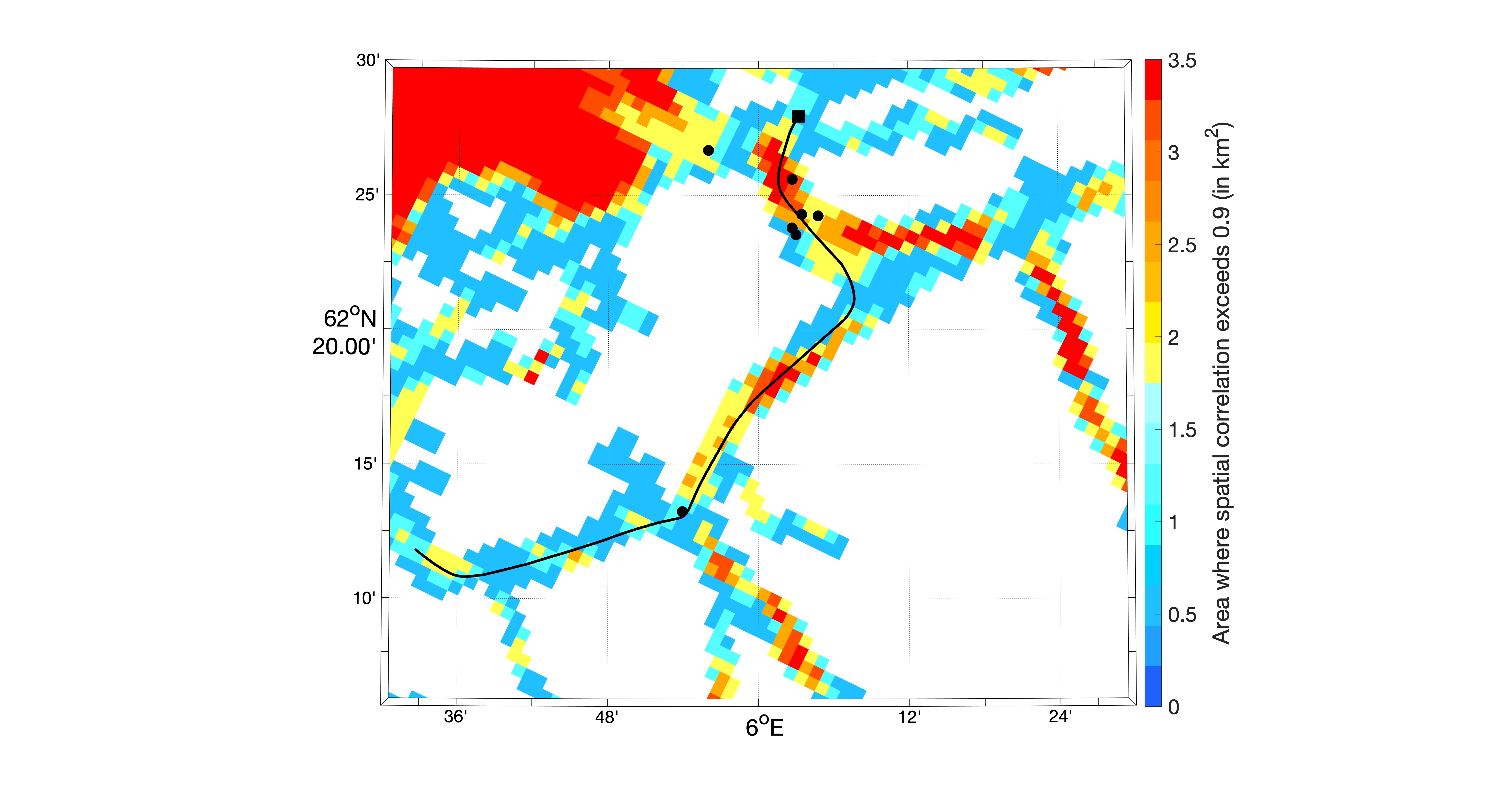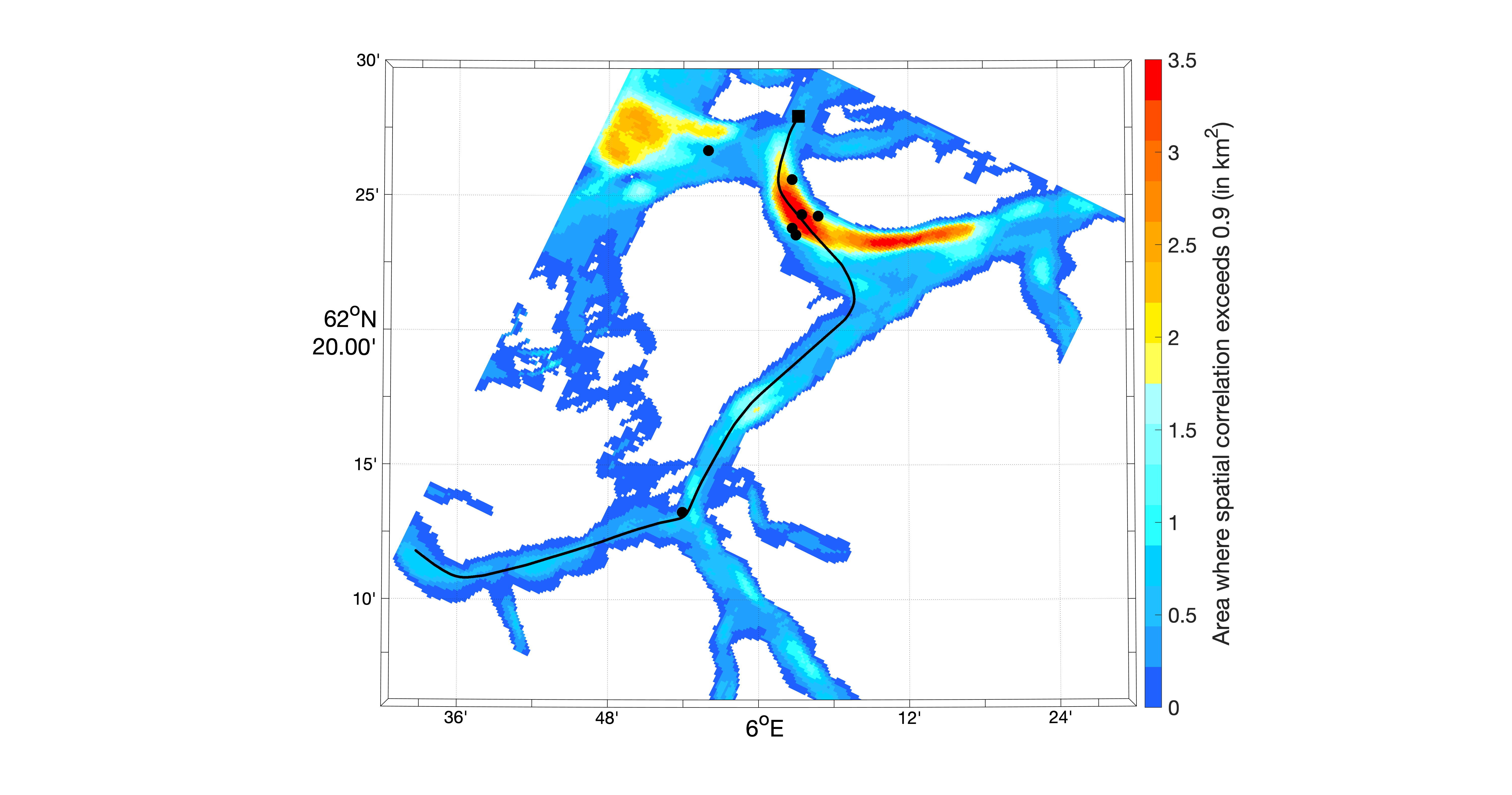 Figur 16. Basert på strømstyrke i overflaten fra NK800 og korrelasjon mellom enkeltpunkter og resten av strømfeltet er arealet der korrelasjonskoeffisienten er over 0,9 beregnet og vist med farger. Fargeskalaene er i km2, og målepunktene er vist som sorte prikker. Den sorte linjen viser eksempel seilas for MS Kvitbjørn.