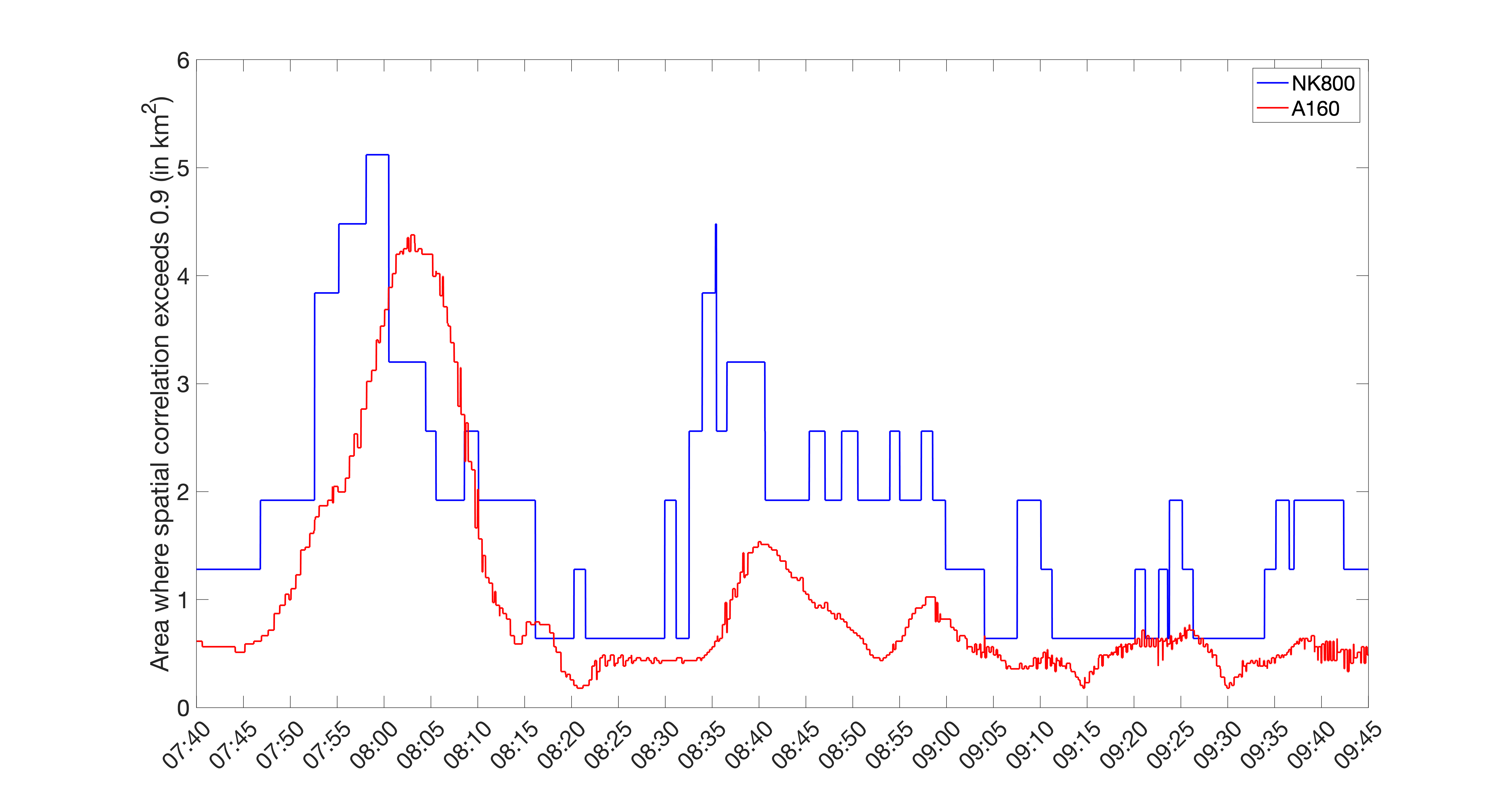 Figur 18. Kurvene viser hvor stort areal (i km2) hvert målepunkt representerer basert på Samskip Kvitbjørn sin seilas 10. februar 2018 fra kl. 07:40 til 09:45. Traséen er angitt i Figur 16 og 17, og verdiene langs vertikalaksen er hentet fra de samme kartene.
