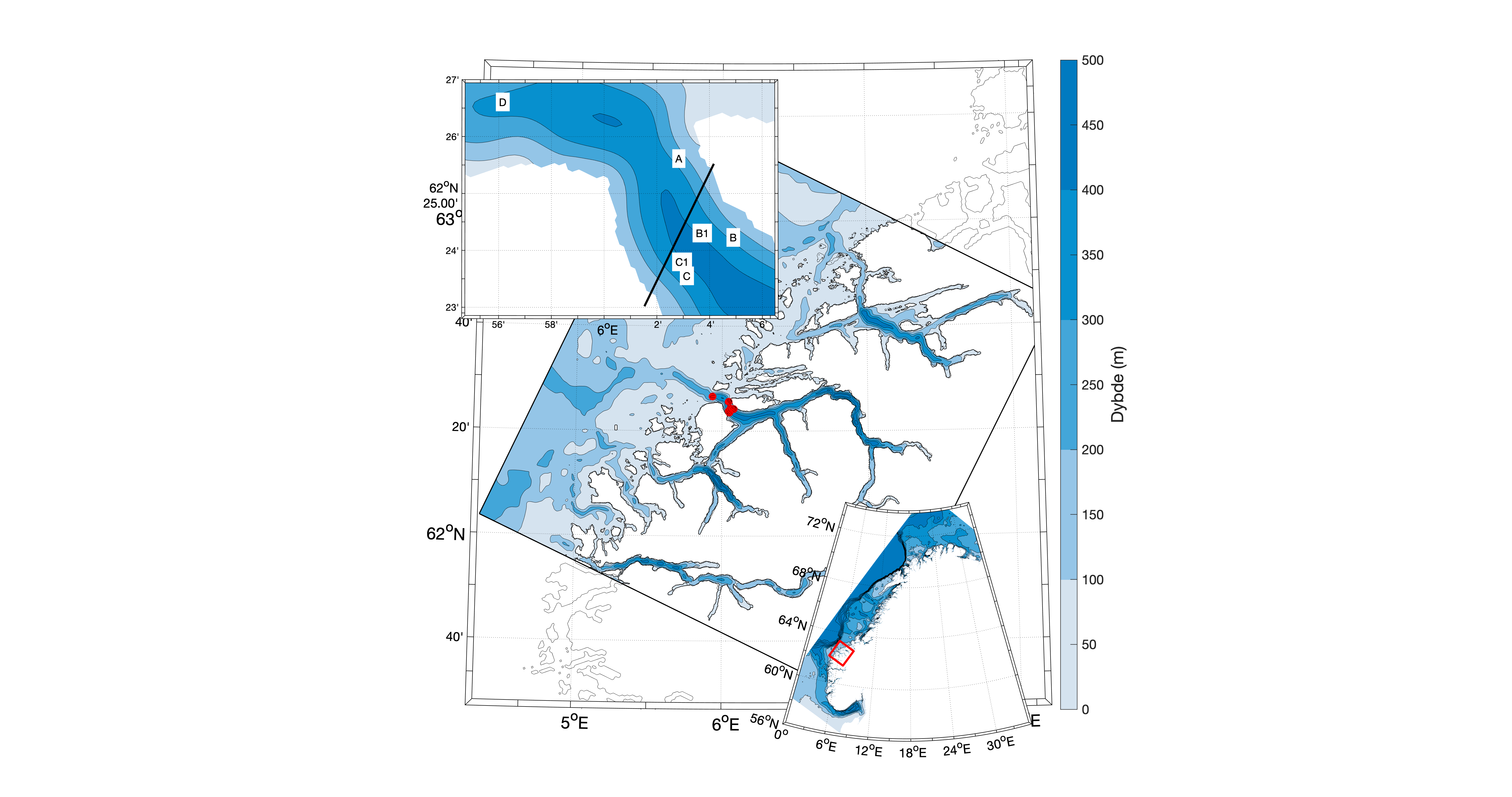 Figur 1. Dybdekart og utstrekning av strømmodellene NK800 (landsdekkende, nede til høyre) og A160. Utsnittet fra Sulafjorden oppe til venstre viser plasseringen av E39-bøyene i 160m-modellens dybdekart, og disse er også angitt med røde sirkler i 160m-kartet. Merk at bøye F sør i Vartdalsfjorden ikke er gjengitt i utsnittet. Den sorte linjen på skrått i Sulafjorden-utsnittet angir vertikalsnittet som vi har hentet ut modellresultater fra og som er brukt for å representere strømforholdene for hele nordre del av Sulafjorden.