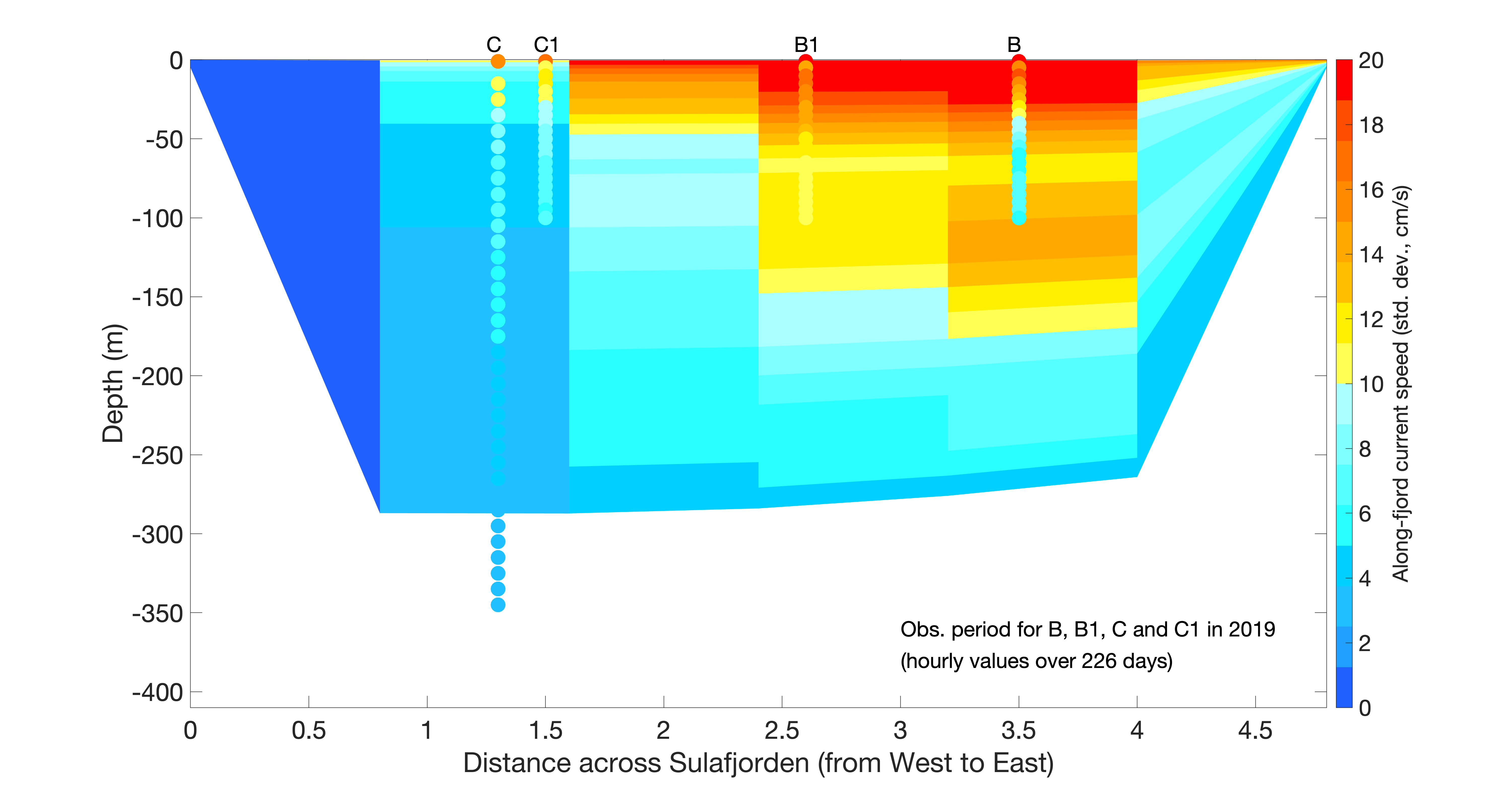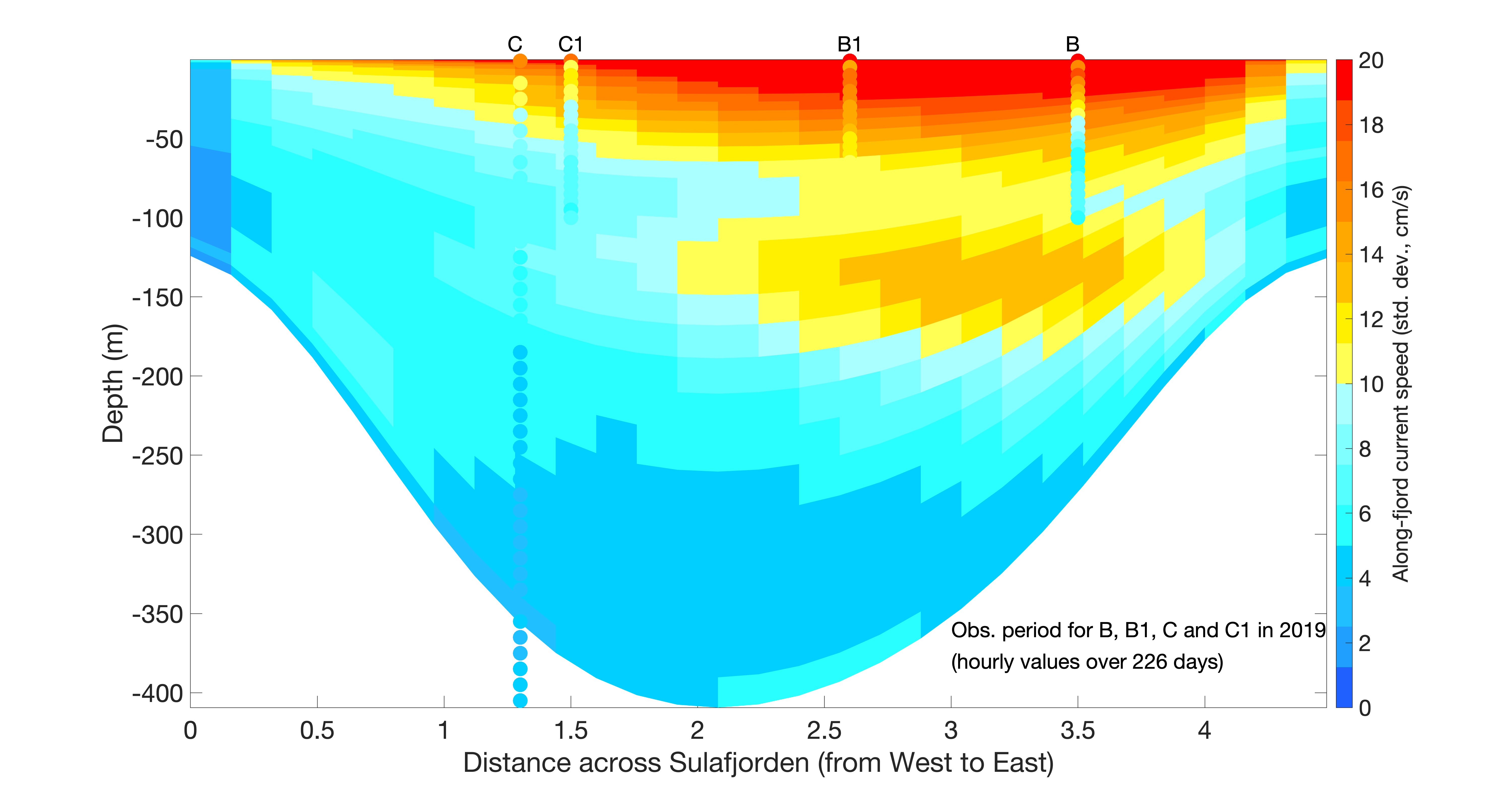 Figur 3. Tilsvarende Figur 2, men her angir fargene standardavviket til strømstyrken langs fjordaksen (i cm/s) i hele vannsøylen gjennom vertikalsnittet angitt i Figur 1. Øverste panel viser standardavvik i strømstyrke fra NK800, mens nederste panel viser fra A160. Modellenes verdier er overskrevet med fylte sirkler som indikere tilsvarende standardavvik fra målingene fra bøyene B, B1, C og C1. Alle standardavvikene er kun basert på strømverdier fra korresponderende tidspunkt, dvs. timesverdier fra 226 dager i løpet av 2019. Horisontalaksen angir avstand fra vest til øst i km.