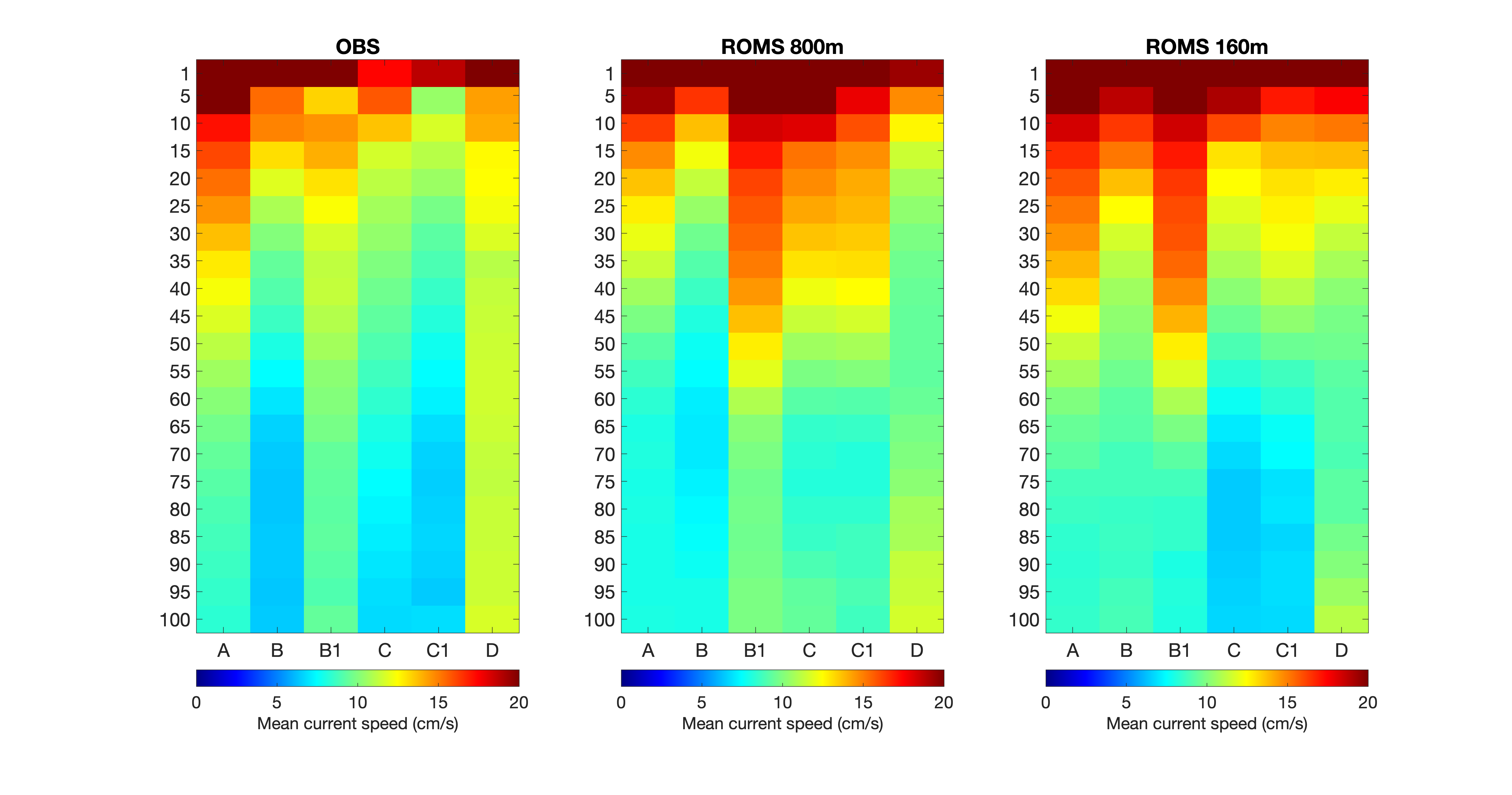 Figur 4. De øverste panelene viser midlere strømstyrke fra bøye A, B, B1, C, C1 og D i de ulike måledypene angitt i meter langs vertikalaksen, hhv. fra målingene (OBS), NorKyst800 og A160. Fargen angir strømstyrke i cm/s i henhold til fargeskalaen under. De to panelene nederst angir midlere modell-avvik i strømstyrke standardisert mot standardavvikene til målingene, dvs. at modellbias er angitt i standardavvik.