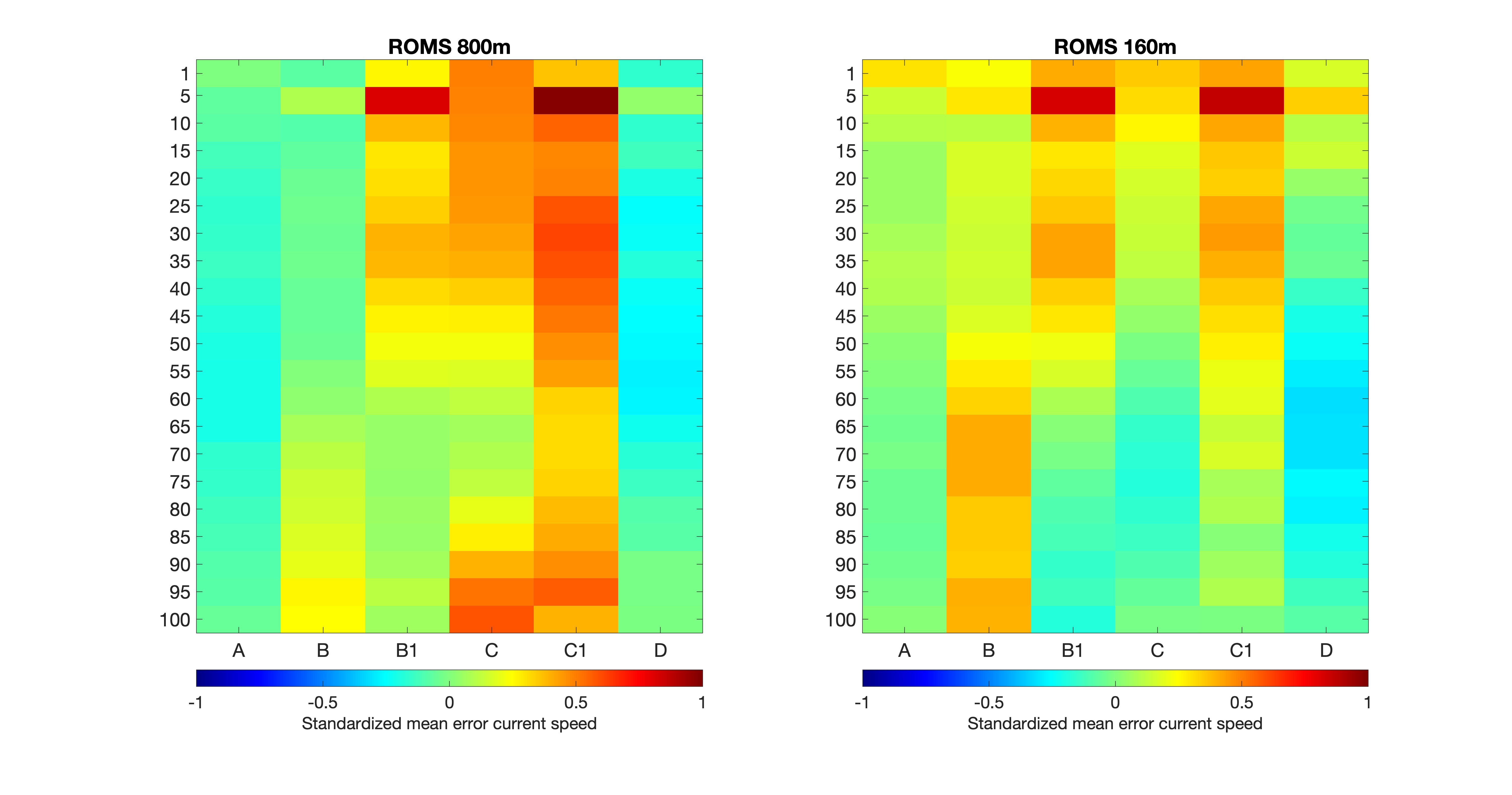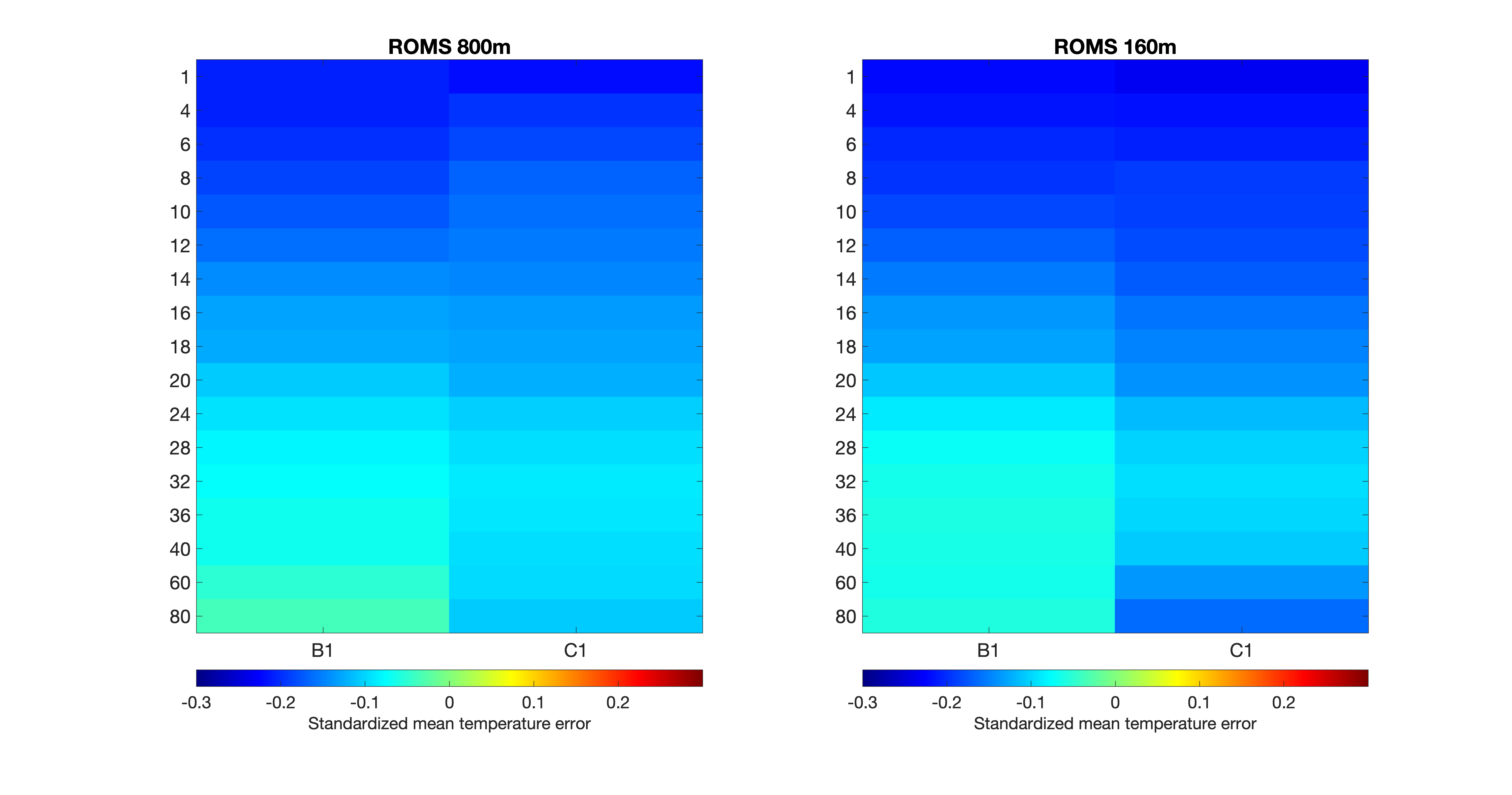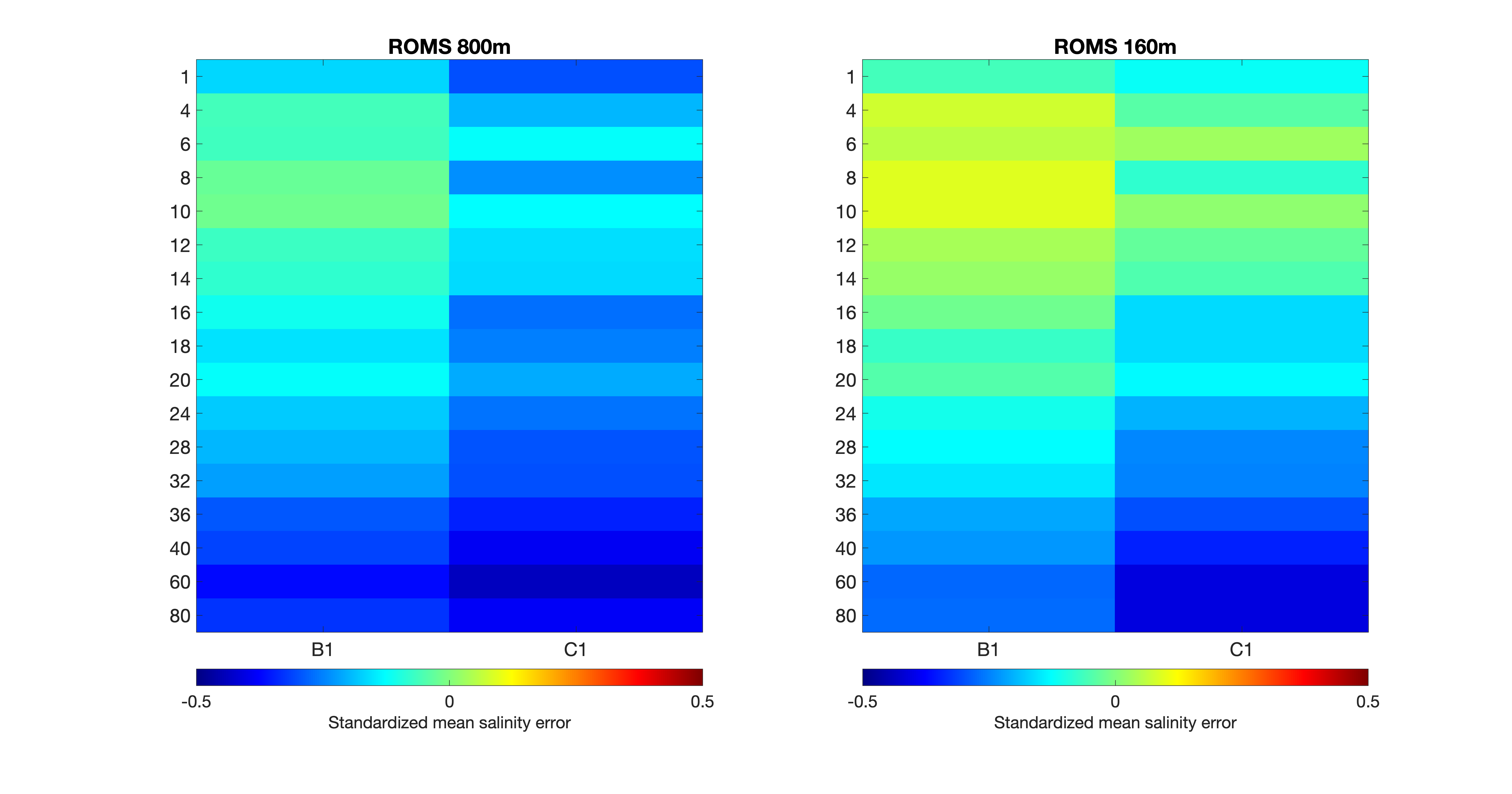 Figur 9. Standardisert modellfeil for saltholdighet (øverst) og temperatur (nederst) fra NK800 (venstre) og A160 (høyre) for alle måledypene angitt i meter langs vertikalaksen. At feilen er standardisert betyr at den midlere modellfeilen (bias) er dividert med standardavviket til målingene, dvs. at fargeskalaen angir modellfeilen i antall standardavvik. Grønnfargen betyr bra overenstemmelse mellom modell og målinger, mens blåfarge betyr at modellen underestimerer noe.