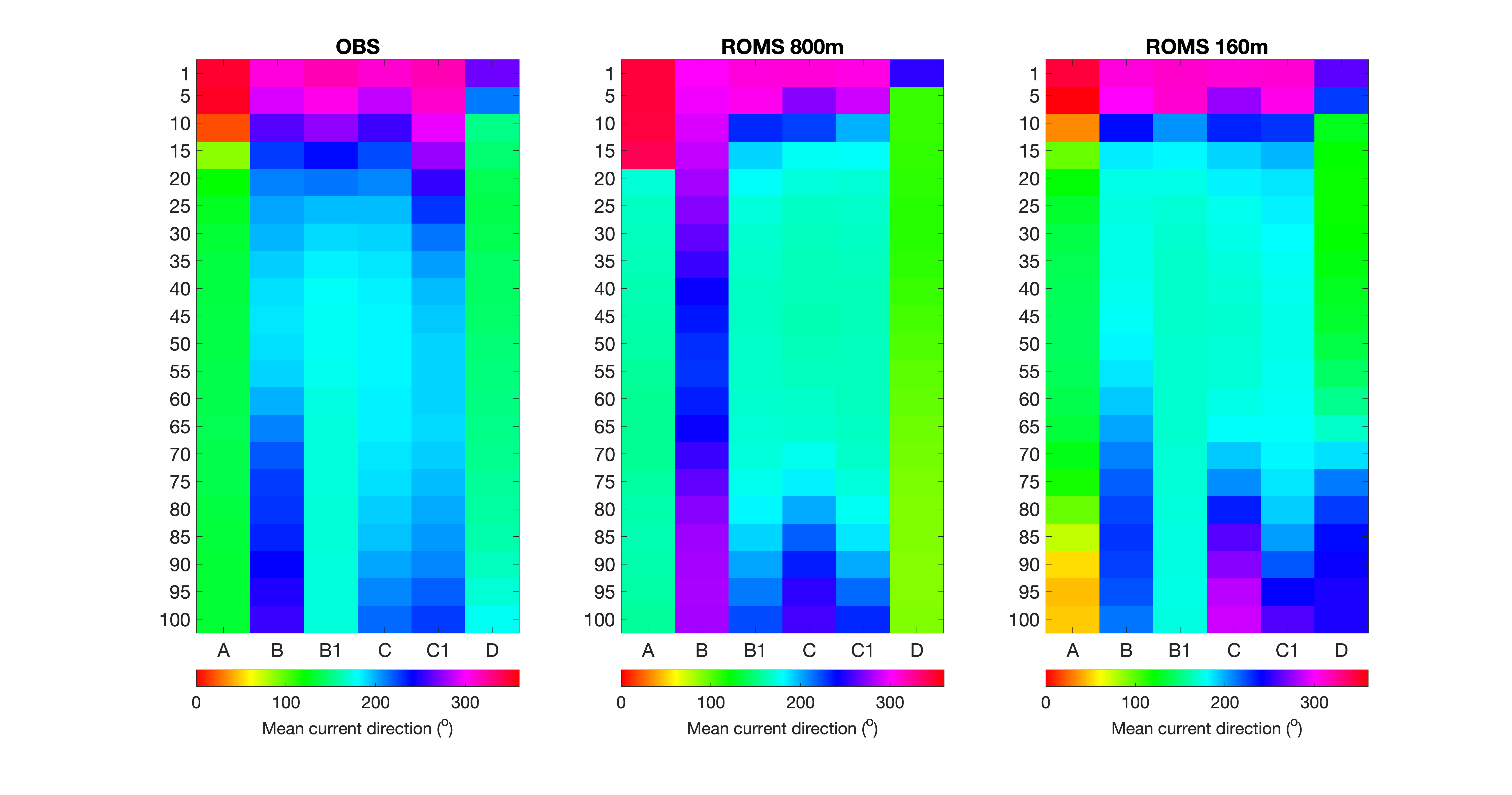 Figur 5. De øverste panelene viser midlere strømretning fra bøye A, B, B1, C, C1 og D i de ulike måledypene angitt i meter langs vertikalaksen, hhv. fra målingene (OBS), NorKyst800 og A160. Fargen angir strømretning i grader i henhold til fargeskalaen under. Mens 0/360o betyr strøm fra sør, så er 90o definert som strøm fra vest. De to panelene nederst angir modellenes bias i strømretning, og fargene er definert slik at blåfarge indikerer god overenstemmelse mellom målinger og modell.