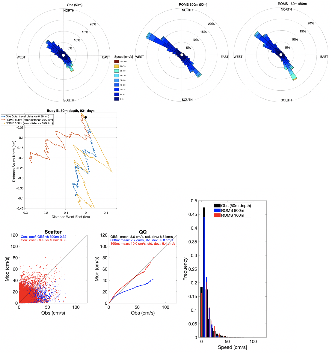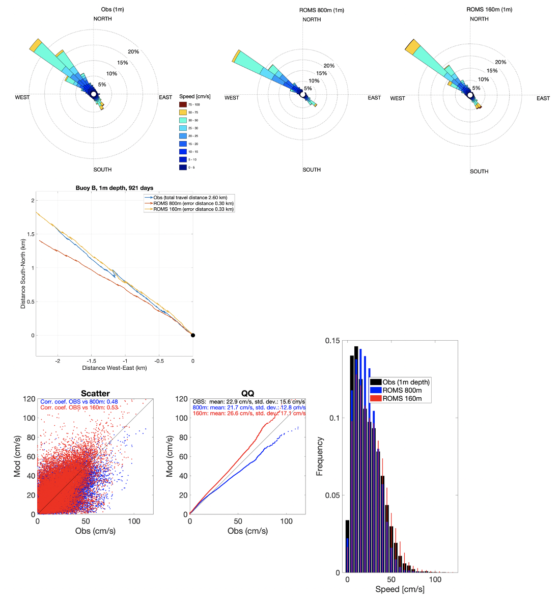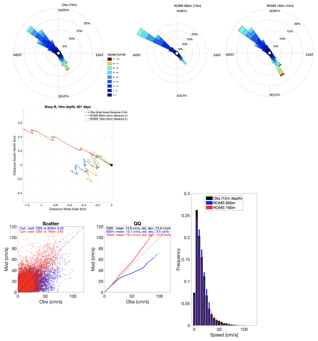 I dette eksemplet ser man fra strømrosene at hovedvekten av overflatestrømmen går mot nordvest og at A160 gjenskaper dette noe bedre enn NK800, spesielt mht. strømretning hvor NK800 dreier strømmen noen grader for mye i vestlig retning. Progressive vektorplott, der alle vektorene som beskriver strømmen er summert, er nyttige for å se om strømmen har en persistent dreining i feil retning. På 1m dyp så ser man det samme som i strømrosene at NK800 har et avvik i strømretning, men at begge modellene treffer godt i forhold til strømstyrken. Ved å sammenligne målt strømstyrke med modellerte verdier kan man lage spredningsplott. Hvis modellen er perfekt, skal alle punktene ligge langs diagonallinja. Strømmodeller er avhengig av flere variable drivkrefter som atmosfæremodellresultater, ferskvannstilførsel og påvirkninger fra storhavet gjennom åpne grenseflater. Små feil i rom og tid av disse inngangsdataene vil introdusere små feil i strømmodellresultatene. Det er også interne forenklinger i strømmodeller (som for eksempel gitteroppløsning) slik at mange modellerte estimater havner utenfor diagonalen. I praksis kan dette bety at modellen gjenskaper flere av de dynamiske episodene, men at dette skjer til feil tidspunkt (eller på feil sted). Det er derfor vanlig å benytte Q-Q-plott (kvantil mot kvantil), som egentlig er et sannsynlighetsplott. I et Q-Q-plott sorteres først observerte og modellerte strømstyrker, før de sammenliknes mot diagonallinja (perfekt modell). I eksempelet fra 1m dyp fra bøye B så ser man at mens NK800 underestimerer de sterkeste strømmene noe, så overestimerer A160 disse tilsvarende. Det siste kan man også lese ut av frekvensdiagrammet som også er vist til slutt i Figur 6. Et frekvensdiagram er nyttig for å finne ut om de ulike strømstyrkene er gjenskapt innenfor de ulike segmentene av strømstyrker. I tillegg til at A160 overestimerer de sterkeste strømmene, så ser man også at modellene har litt for få episoder med svak strøm.