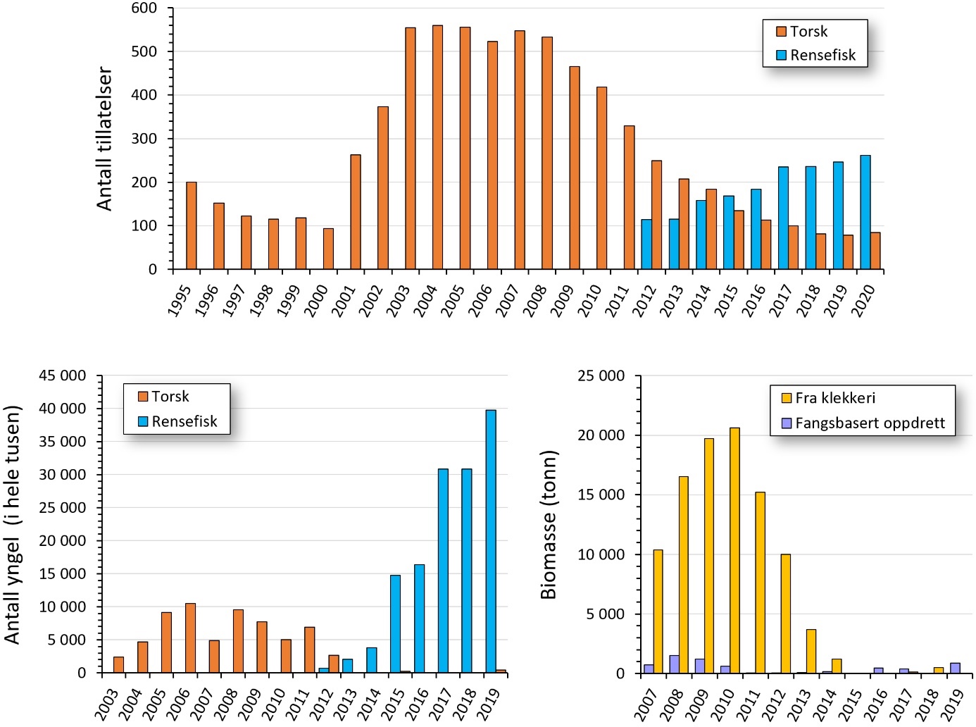 Figur 2.3. Antall tillatelser for oppdrett av torsk (øverst), salg av yngel av torsk og rensefisk (nede til venstre) og salg av oppdrettet torsk fra klekkeri og villfanget (nede til høyre). Kilde: Fiskeridirektoratet.