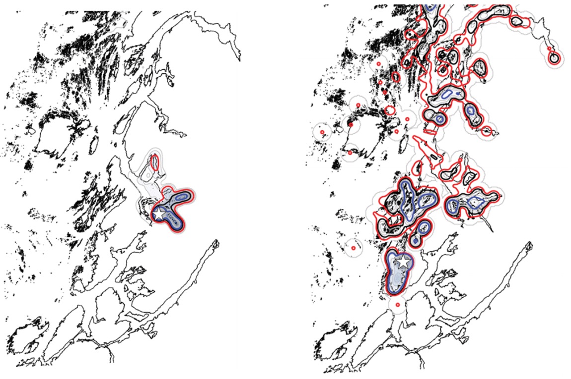 Figur 2.2. Kart som viser drift fra to gytefelt i Nordland. Linjene viser sannsynlighetsfordeling over hvor egg sluppet ut på punktet markert med en stjerne vil havne. Grå tynne linjer dekker området som består av 100% av fordelingen av egg etter en periode på 30 dager med drift. Røde linjer tilsvarer 75 % av fordelingen. Svarte linjer er 50% fordelingen, mens blå linjer er området som inneholder 25 % av fordelingen. Kartet til venstre viser et gytefelt der egg og larver holdes inne i fjorden og i liten grad driver bort fra gytefeltet. Kartet til høyre viser et gytefelt der egg og larver spres i et større område. Ofte vil også retningen eggene driver fra disse gytefeltene i mye større grad være påvirket av varierende forhold i vær og vind.