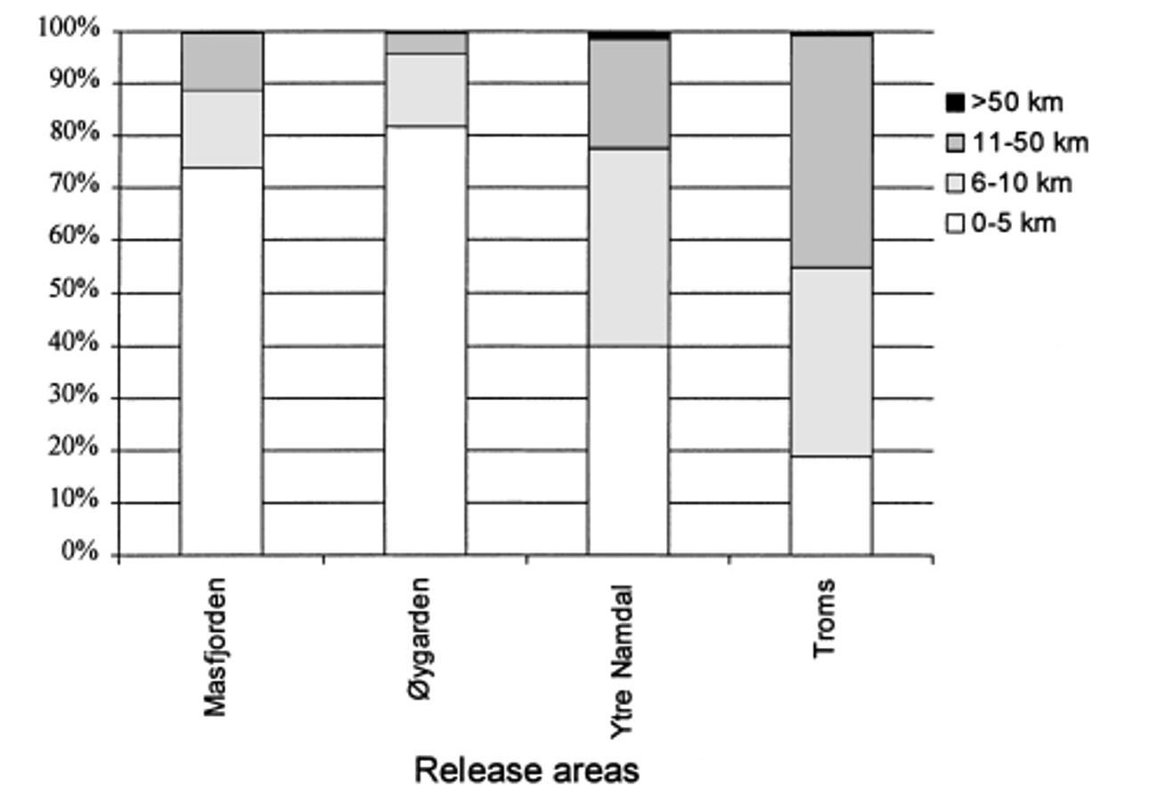 Figur 3.1. Fordeling av avstand fra utsetting til gjenfangssted fra utslipp av 0- og 1-gruppe torsk i Masfjorden (utsetting: 1985-91, # gjenfanget:1860), Øygarden (utsetting: 1991-95, #gjenfanget: 14 363) Ytre Namdal (utsetting: 1991-94, # gjenfanget = 1668) og Troms (Ullsfjord / Stålvikbotn) (Utsetting: 1994, #gjenfanget = 1400), Svåsand m.fl. (2020).