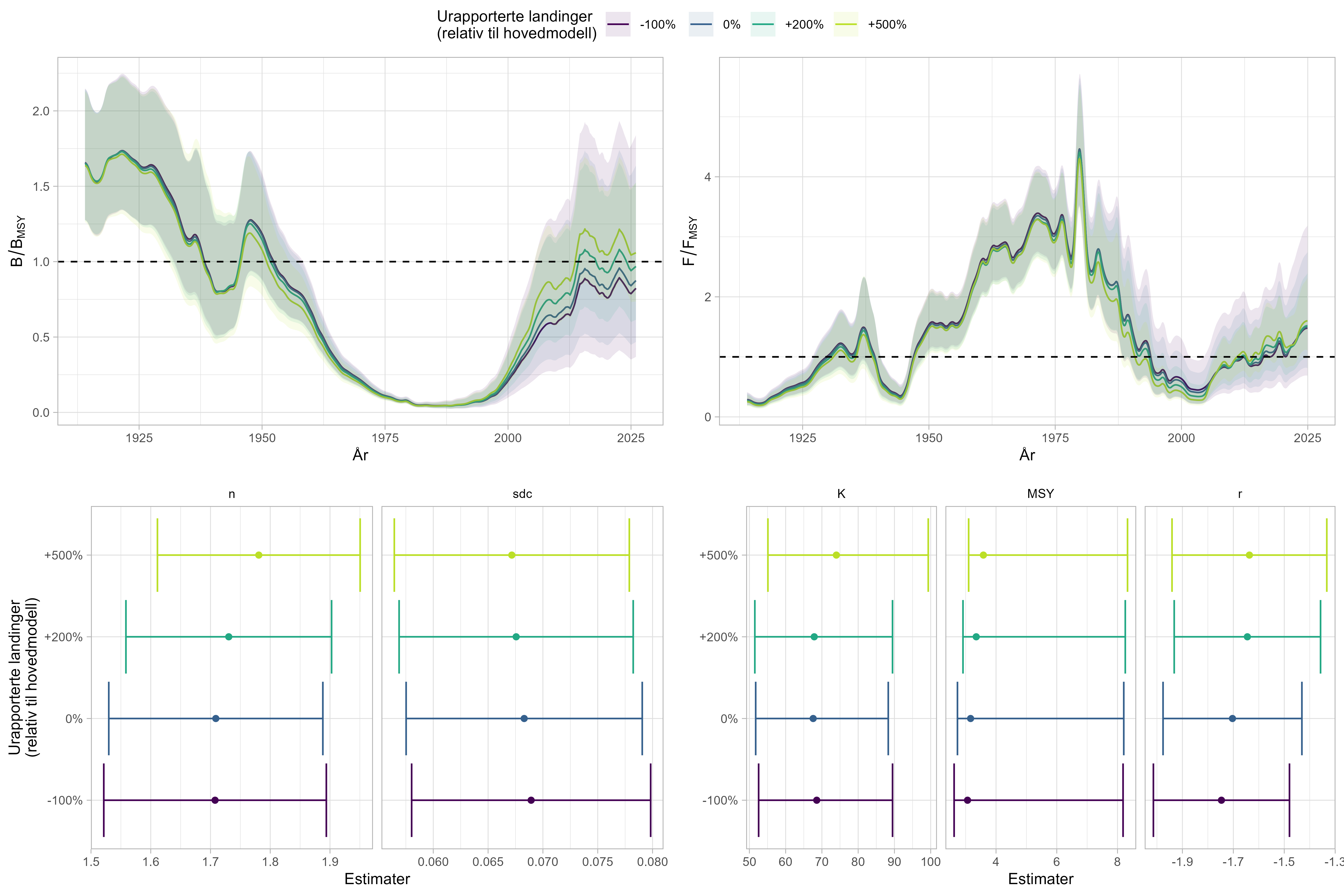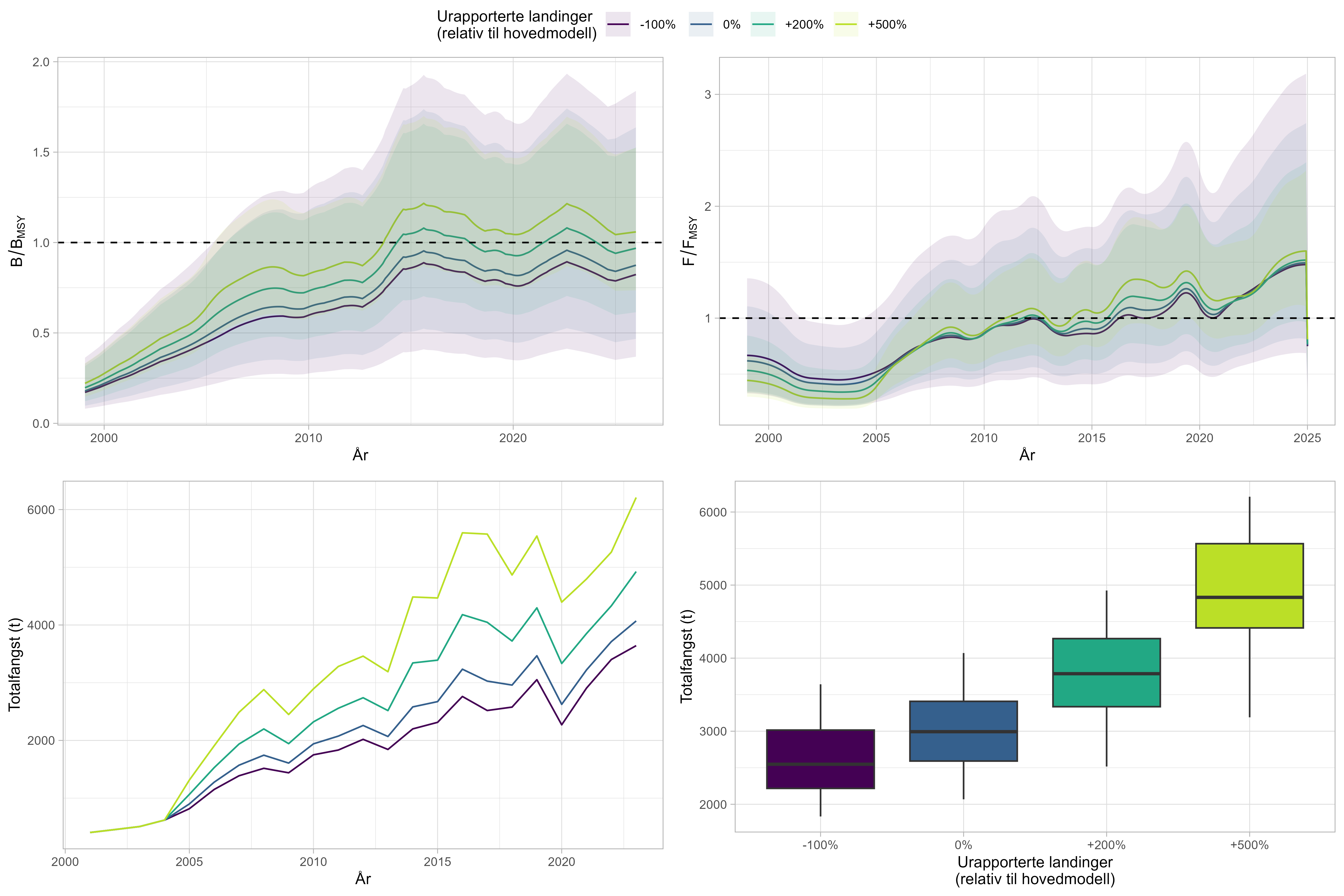 Beregning av forholdet mellom urapporterte og rapporte landinger fra fritids- og turistfiske er basert på en sammenligning mellom rapporterte landinger fra fritidsfiskere og estimerte landinger i fritids- og turistfiske (Ferter mfl 2022, hovedsakelig i Troms fylke) og ekspertkunnskap. Antagelsen er beheftet med relativt stor usikkerhet, fordi det kan være store lokale forskjeller og forskjeller mellom år. Det er også svært vanskelig å beregne dette langt bakover i tid. Sensitiviteten med hensyn til urapporte fangster ble analysert ved at bestandsmodellen ble kjørt med alternative antagelser på urapporterte landinger, fra -100% sammenlignet med hovedmodellen (dvs. ingen urapporterte fangster) til +500% urapporterte landinger (Figur 13). Til tross for den store spennvidden som ble utforsket, med tildels urealistisk høye urapporter landinger, viser resultatene at mulige feil i antagelsen på urapporterte landinger ikke har en signifikant effekt på bestandsutviklingen og parameterestimatene (Figur 14).