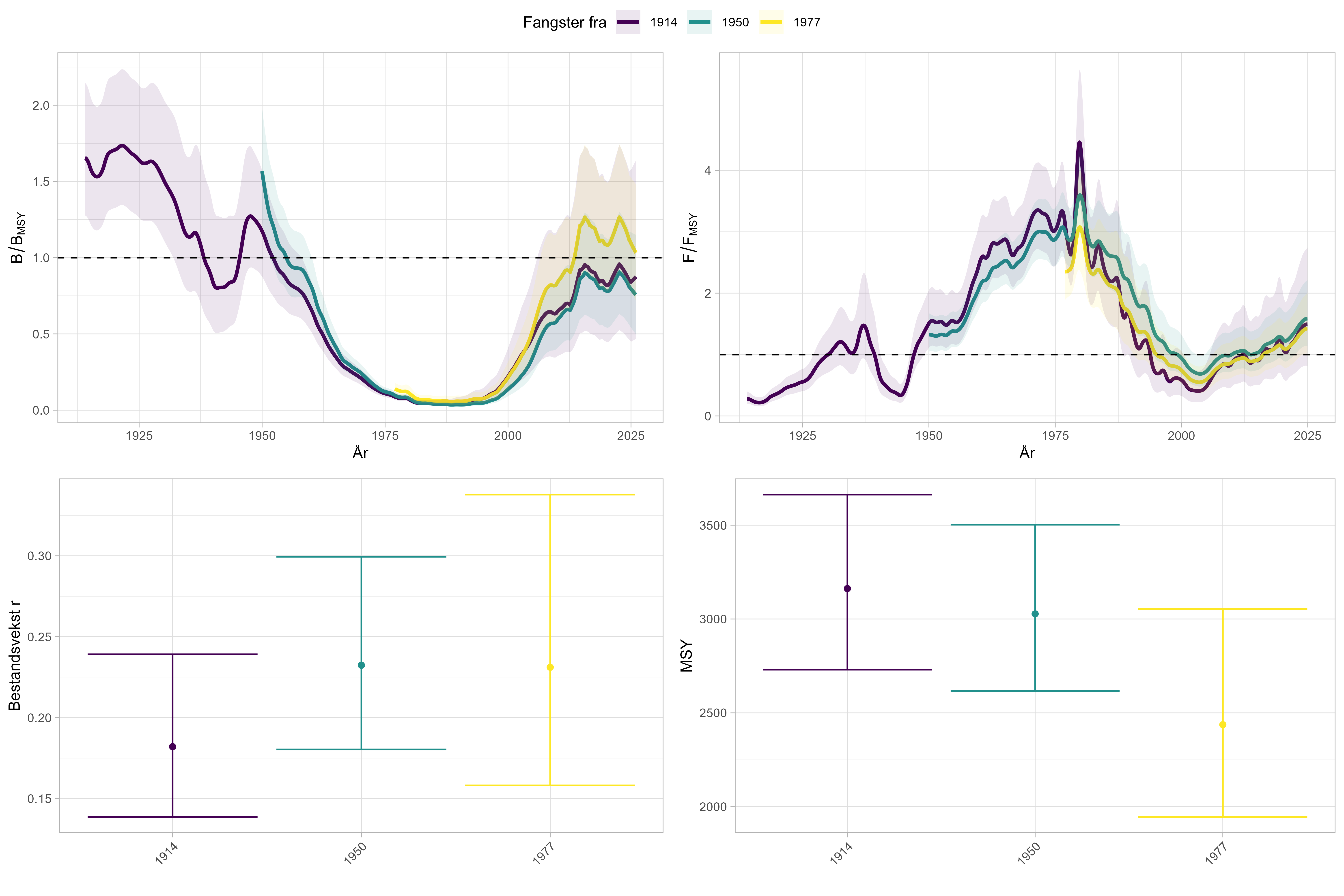 Fangststidsserien i den endelige bestandsmodellen inkluderer fangster fra 1914. Kortere fangsttidsserier resulterte i mindre, men ikke signifikante forskjeller (Figur 10). Avviket, både på bestandsutviklingen og parameterestimatene, var større når den korteste tidsserien (fra 1977) ble brukt. Bruk av den korteste tidsserien resulterte i større usikkerhet og et mer optimistisk estimat på bestandstilstanden i 1977 enn i de andre modellene, noe som skalerer opp til en høyere bestandsbiomasse i 2024. Modelldiagnostikken viste dessuten problematiske retrospektive mønster og en lavere stabilitet i en jitter-analyse, med mer avvik og høyere risiko for konvergeringsfeil. Årsaken er at den korte tidsserien resulterer i en en-veis-retning av fangstutviklingen som utelater tidligere topper og svingninger som inneholder viktig informasjon for modellestimeringen. Estimatene ble imidlertid mer lik den endelige modellen når tidsserien fra 1950 ble inkludert, som også inkluderer en tidligere topp i fangstene. Forskjell i bestandsparametere og MSY ble med denne settingen neglisjerbar. Bestandsutviklingen viste kun mindre, ikke-signifikante forskjeller mellom de tre konfigurasjonene.