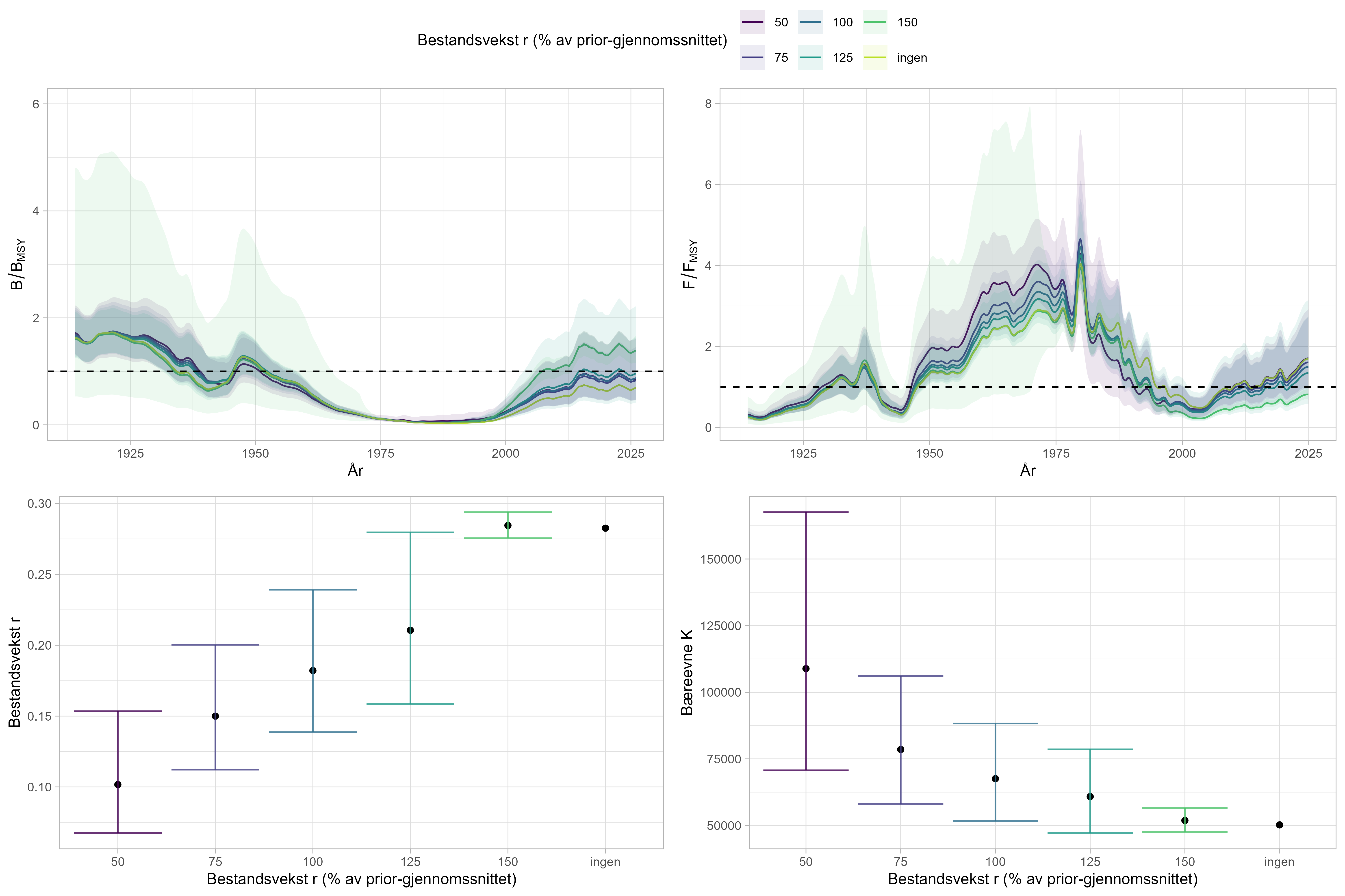 Bestandsvekst r er sammen med bæreevne K og modellform n nøkkelparametere i SPICT som i stor grad definerer bestandsproduktiviteten. En informativ prior på r kan bedre estimater av de andre parametrene og bestandsdynamikken, og dermed påvirke bestandsvurderingen i relevant grad. Vi testet følsomheten til modellestimatene mot en spesifikk antagelse på r-prioren ved å variere gjennomsnittet stegvis fra 50% til 150% av standardverdien som ble brukt i hovedmodellen. Resultatene viser at definisjonen av r-prioren har relativt stor betydning for estimatene, ved at r-estimatene er positiv korrellert med den, mens K-estimatene er negativ korrelert (Figur 15). Sammenlignet med hovedmodellen er forskjellene på parameterestimatene og bestandsutviklingen ikke signifkant. Det gjelder også når man ikke inkluderer en prior på r i det hele tatt, selv om modellen får da konvergeringsproblemer og estimerer en r som er tendensielt for høyt. En lignende, men mindre effekt ble funnet når man øker eller reduserer standardavviket til r-prioreren endres: jo større det er jo mindre informativt er prioren og viser da en ikke-signifikant tendens til litt høyere og mer usikre r-estimater. Dette påvirker imidlertid bare bestandsutviklingen marginalt. Unntaket er når man øker prior-gjennomsnittet med 150%. Da økte usikkerheten betydelig og modellen fikk konvergeringsproblemer. Dette tyder på at selv om den ellers er ganske robust mot små endringer av den valgte r-verdien, finnes det noen vippepunkter, hvor mer ekstreme antagelser gir problemer i bestandsmodellen. Dette understreker at det er viktig å gi modellen en prior på r basert på ekspertkunnskap og kunnskap fra litteraturen.