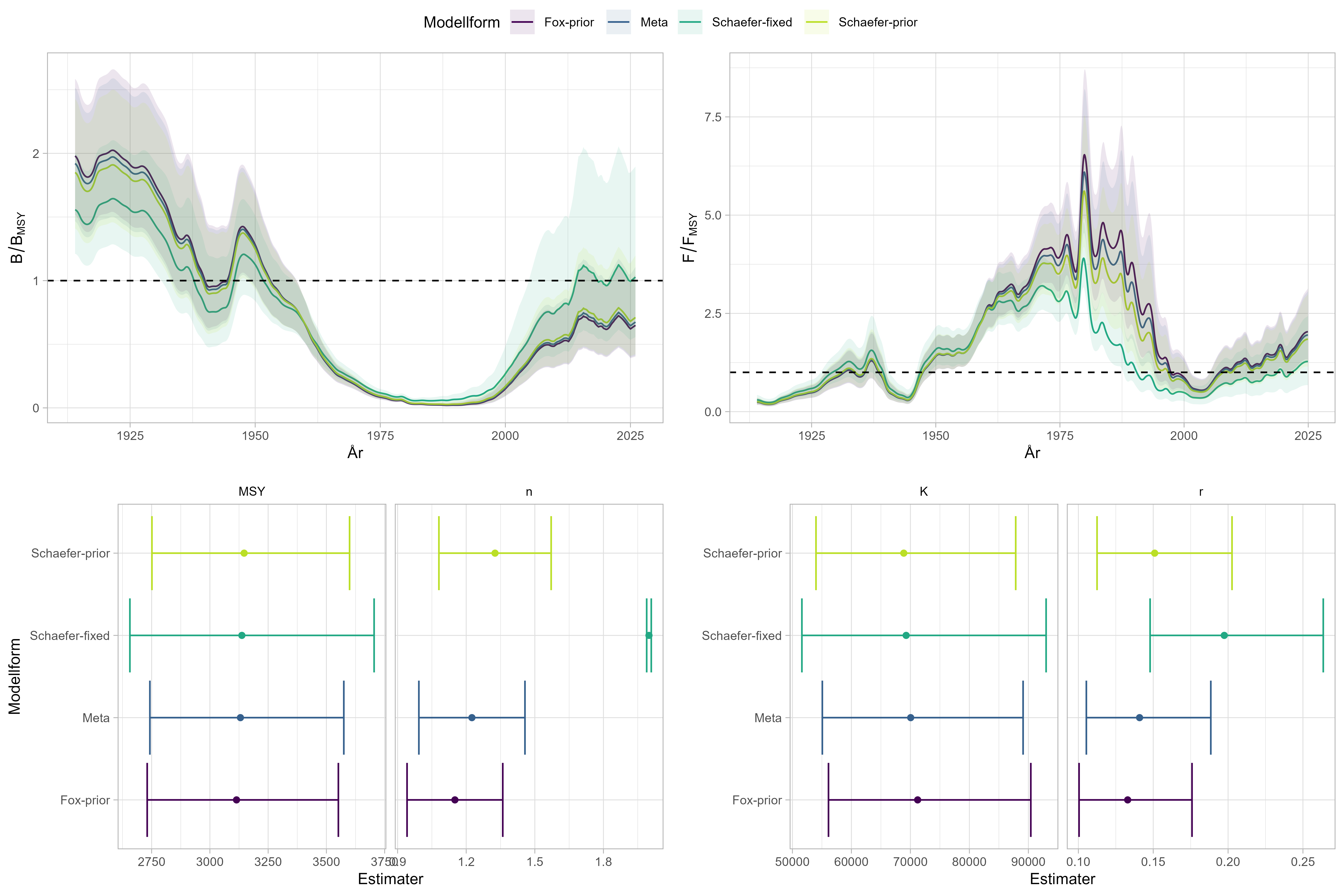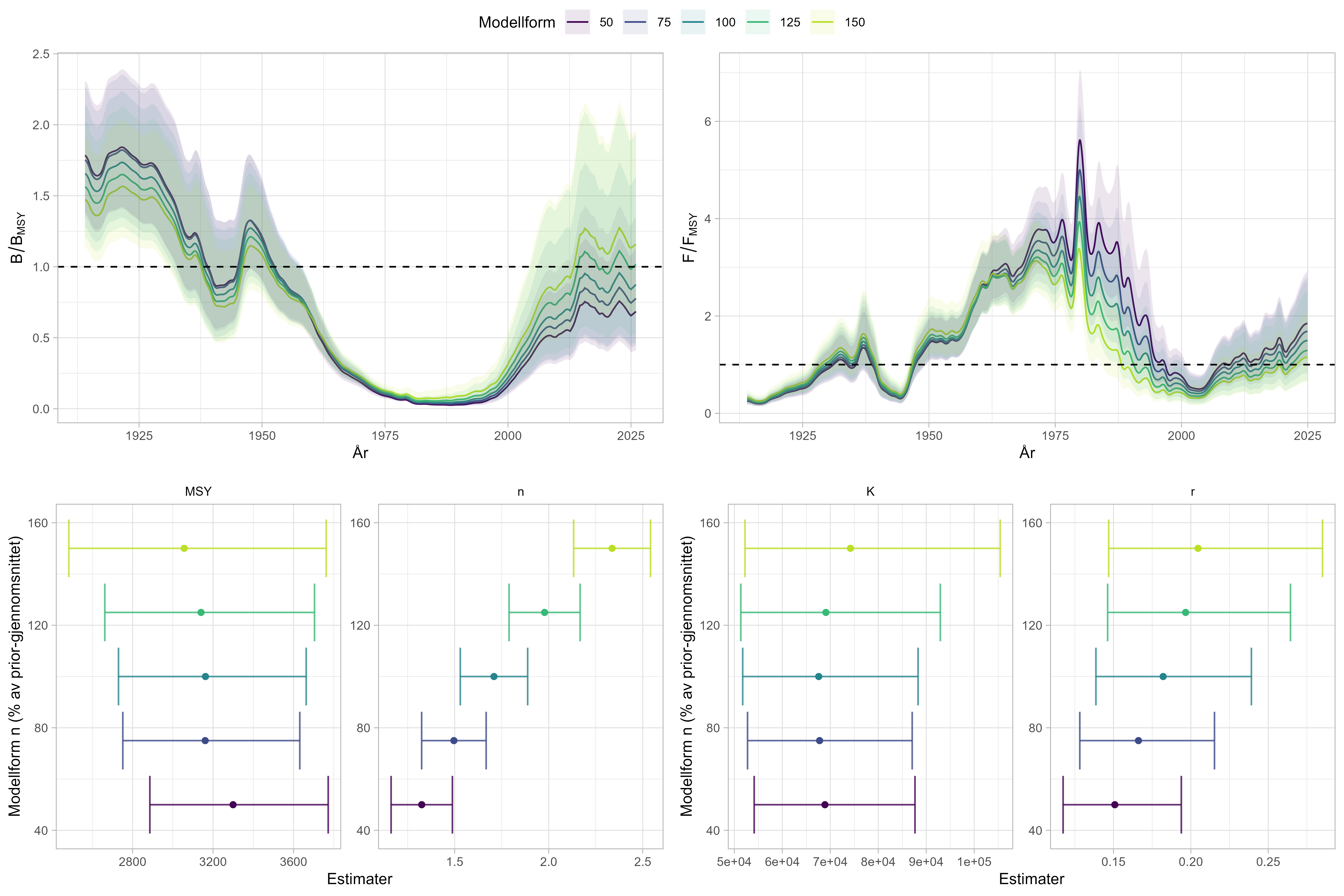 Modellformen n bestemmer hvor BMSY ligger i forhold til K og dermed hvor produktiv en lav bestand er. Hovedmodellen estimerte n til å være lavere enn 2 (Tabell 1). Det vil si at produksjonskurven ikke er symmetrisk, men at BMSY er ved en lavere bestandsstørrelse enn K/2. Alternative modellkonfigurasjoner med enten spesifikt definerte prior på n (Figur 16) eller variasjoner av hovedmodellens prior (Figur 17) bekrefter både en sterk trend mot n-estimater <2 og at resultatene blir ganske like uavhengig av prior-definisjonen. Fiksering av modellformen tilsvarer en Schaefer-modell (n=2), fører til mindre men ikke signifikante endringer av de andre parametrene og bestandsutviklingen. Resultatene bekrefter en forventet korrelasjonen mellom r og n, der lavere n-verdier kompenseres med en høyere r-verdi og motsatt. I kombinasjonen resulterte det i en relativ lik bestandsproduktivitet og bestandsutvikling.