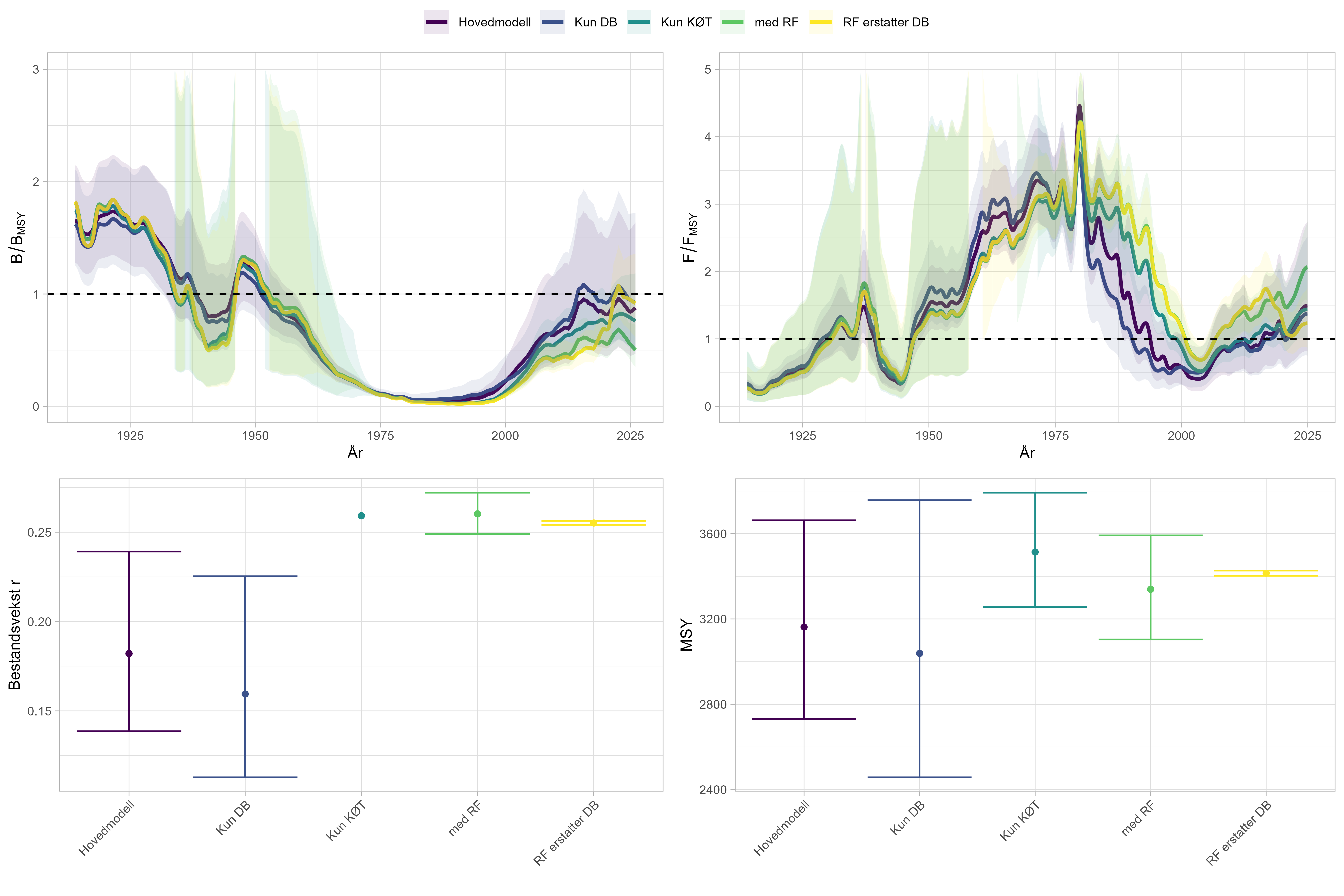 Bestandsmodellen ble implementert i modelleringsrammeverket SPiCT (Stochastic surplus Production model in Continuous Time, Pedersen og Berg 2017), som er en foretrukket biomassemodell i ICES (ICES 2024a), og bygger på en tidligere analyse (Lindgård 2023) som viste at SPiCT kan produsere estimater som er plausible og som oppfyller akseptansekriterier for en slik modell. Flere modellkonfigurasjoner med forskjellige kombinasjoner av prior, bestandsindekser, lengde av fangsttidsserien, etc. ble sammenlignet for å bestemme en best mulig konfigurasjon basert på ekspertvurderingen. Både en grunnleggende versjon av modellen (Lindgård 2023) uten prior og fangster bare tilbake til 1977 og nesten alle ytterlige konfigurasjoner som ble testet oppfylte sentrale akseptanskriterier. Den endelige konfigurasjonen er derfor primært et resultat av en iterativ optimering og finjustering som bruker tilgjengelige informasjonen til å gi robuste bestandsestimater. Resultatet er en endelig bestandsmodell som inkluderer hele fangsttidsserien tilbake til 1914, antagelser på fritidsfiske fangster, alle prior som beskrevet, og bestandsindekser fra kystøkosystemtoktet og elektroniske dagbøker. Indeksen basert på data fra referanseflåten ble vurdert men ble ikke tatt med i den endelige modellen fordi datagrunnlaget bakover i tid var for dårlig. Den endelige bestandsmodellen, eller “hovedmodellen”, detaljeres i de følgende underkapittelne. I det følgende vises resultater fra alternative modellkonfigurasjoner samt en sensitivitetsanalyse.