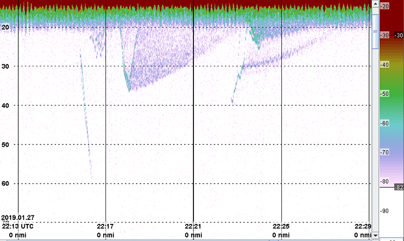To accommodate other acoustic instrumentation (ADCP, MS70 sonar), the pinging of the EK80 was controlled via the Simrad K-sync system. A nominal ping interval of 2 s was set with a 3-phase operation (ping EK80 and sonar, ping EK80 and sonar, ping ADCP, repeat). When the water depth was greater than about 1000 m, it was possible to ping the ADCP together with the EK80 and sonar without causing interference on the EK80, in which case all systems pung simultaneously at an interval of about 2 s.