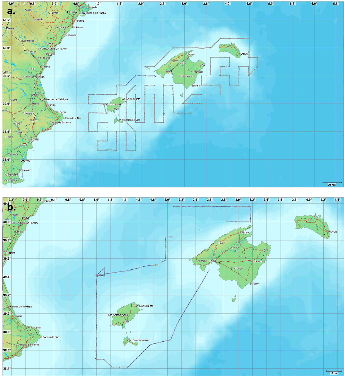 Figure 1. Maps showing the areas covered by the Simrad MS70 sonar in the 1st (a) and 2nd (b) cruise legs in the Balearic Sea around the islands Menorca, Mallorca and Ibiza.