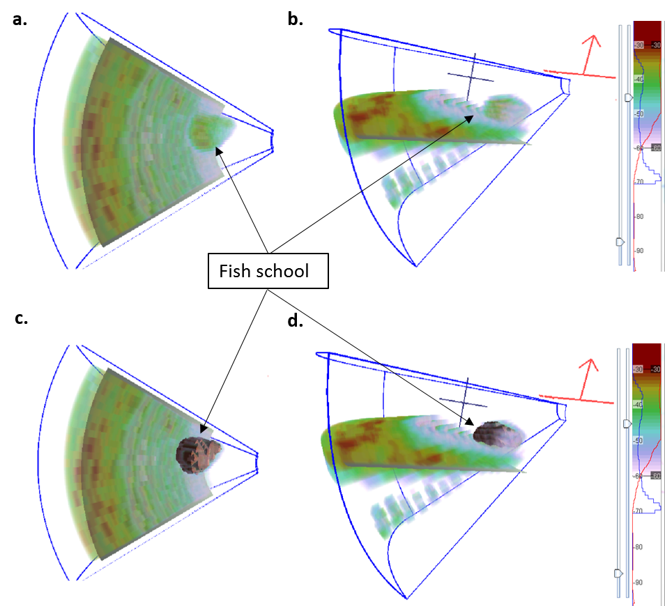 Figure 3. Example of school number 11 (table 3) seen from above (a), from the side (b) and with the extracted school data marked in panels c and d. The data have been pre-processed and thresholded to -60 dB.