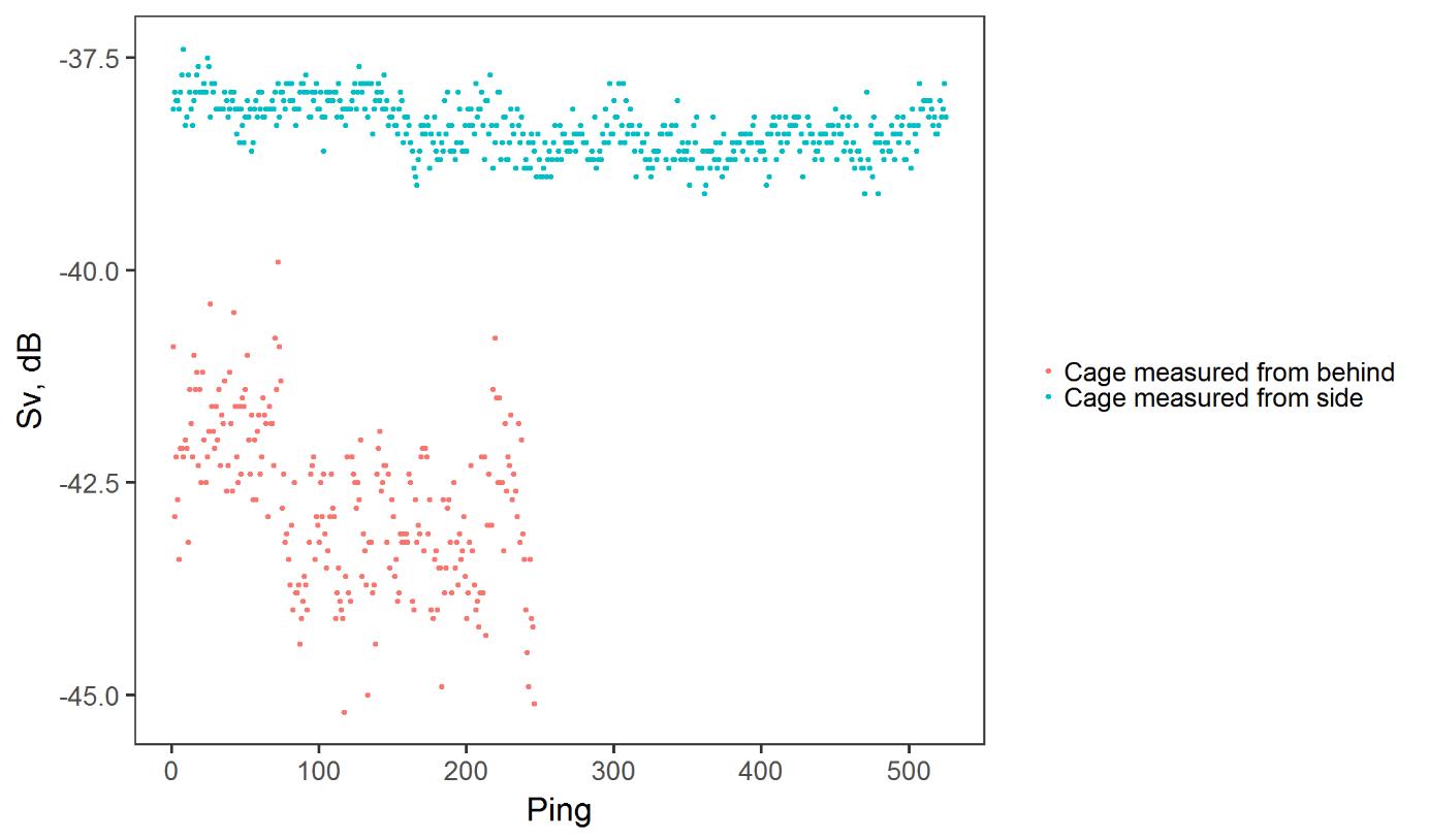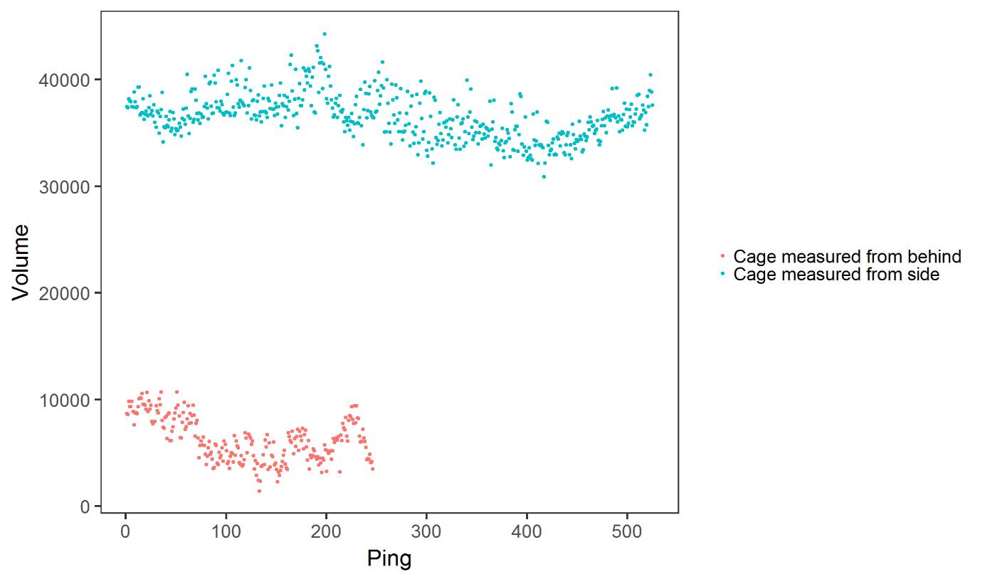 We remained at about 150 m from the cage and monitored it from the side (perpendicular to vessel heading) and from behind (along vessel heading) (Figure 4). The average backscattering strength was -35.46 dB from the side and -41.80 dB from behind (Figure 5). The volume was on 52292 m3 when estimated from the side and 1000 m3 when estimated from behind (Figure 6). Backscatter from fish is strongly dependent on the incidence angle of the acoustic beam, being strongest when approximately perpendicular to the sagittal axis (Cutter and Demer, 2007; Holmin et al., 2012). The results therefore indicate that the BFT orientation inside the cage was mainly the same as or the opposite of the vessel heading. Professional observers and divers report that the fish are milling in the cage and that the cage is deformed as it is towed. This was also observed in the acoustic data where the horizontal dimensions were 114 x 65 m. The elongated shape of the cage where a larger proportion of the milling fish would be swimming along the longer sides of the cage at all time could explain the stronger backscattering when the cage was measured from the side compared to from the behind.