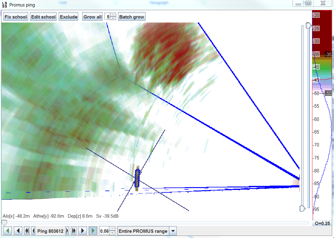 PROMUS provides an estimate of school volume. The advantage of the MS70 sonar compared with fisheries sonars is that the individual beam opening angles are narrower and they form a 3D matrix. This allows for measurements of the whole school in each transmission providing more accurate estimates.