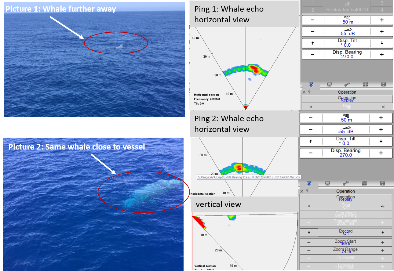 Figure 9. A whale (Ziphius cavitostros) photographed from the vessel first further away and then close to vessel before it dived and was captured in the MS70 sonar.