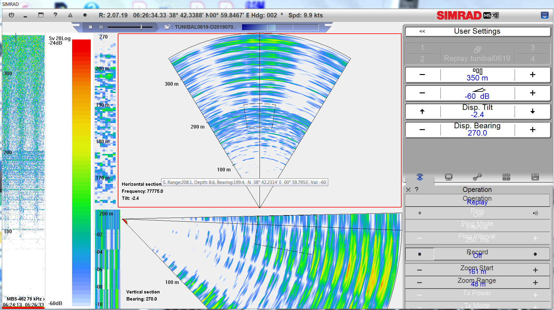 The Institute of Marine Research (IMR) and the Polytechnic University of Valencia (UPV) were invited by ICCAT Atlantic-Wide Research Program for Bluefin Tuna (GBYP) to carry out a feasibility study on the use of scientific multibeam sonar, Simrad MS70, to characterize the Atlantic Bluefin Tuna spawning stock in the Balearic Sea. The study was to be carried out in June and July 2019 on board the research vessel B/O “Ángeles Alvariño” owned by the Spanish Institute of Oceanography while on an annual ichtyoplankton survey targeting BFT tuna larvae. The acoustic survey was also to be coordinated with an aerial survey focusing on intercalibrating aerial estimates of BFT school biomass and abundance in the same area and time. The aim was to measure the same BFT schools from the airplane and with the MS70, compare the measurements and if possible, use the sonar estimates to validate the aerial estimates. This project is a part of a longer-term goal of ICCAT to develop acoustic indices for Eastern BFT spawning stock biomass. The technical specifications of the current study were as follows: