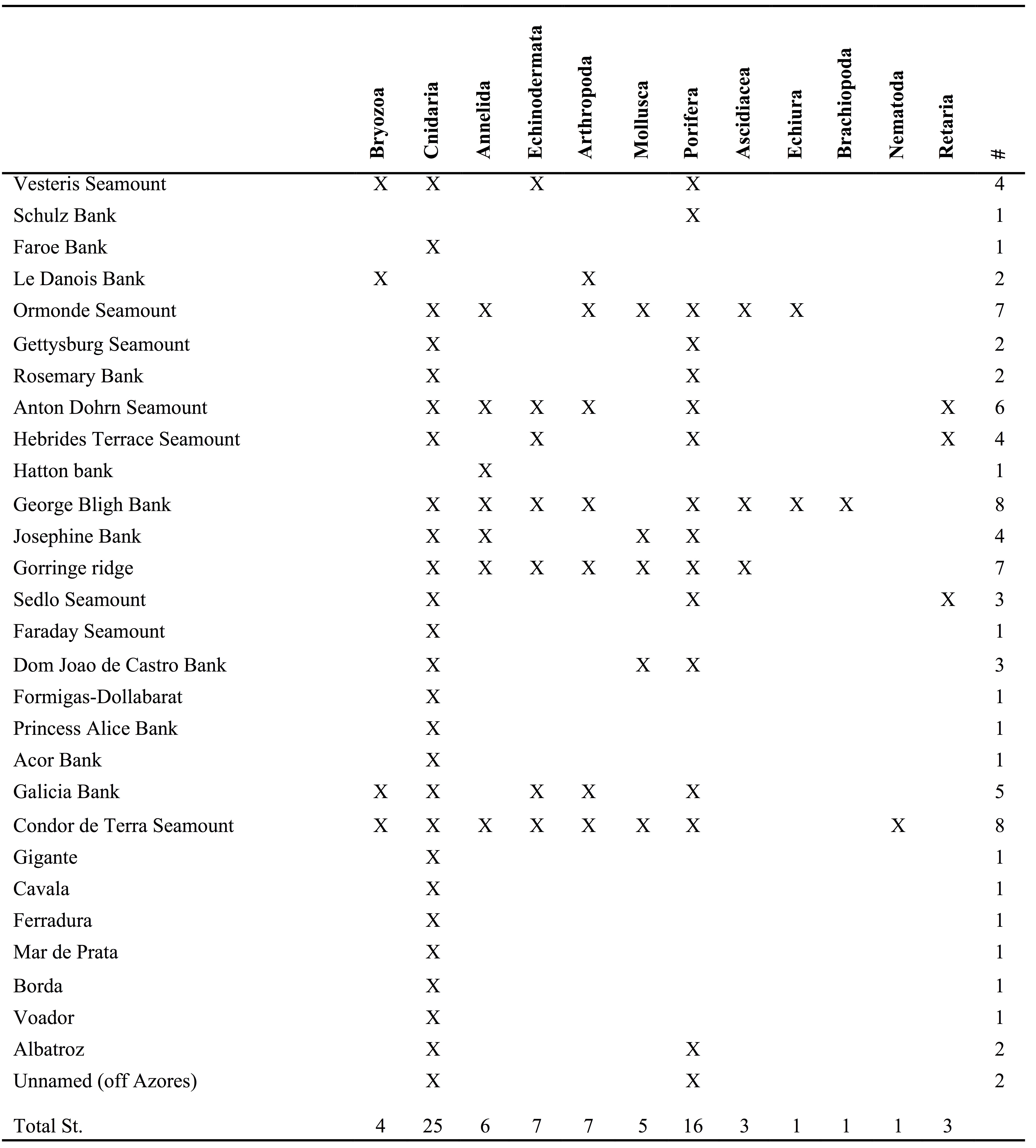 One of the most well studied seamounts is the Ormonde Seamount (Region IV) with a total of 5 publications describing the benthos and with registrations of species occurrences from 7 different phyla (Table 4). A total of 59 mega benthic taxa were described from Ramos et al. (2016) where Cnidaria (19 taxa), Porifera (10 taxa) and Echinodermata (9 taxa) were dominant benthic phyla. Ormonde seamount hosts at least 12 coral species/taxa from the groups Anthipatharia, Gorgonia, Stylasterida and Pennatulacea and 8 sponge species from Demospongia (e.g. Cladorhizidae) and Hexactinellidae. Furthermore, the gastropod fauna has been described (Ávila et al. 2003).