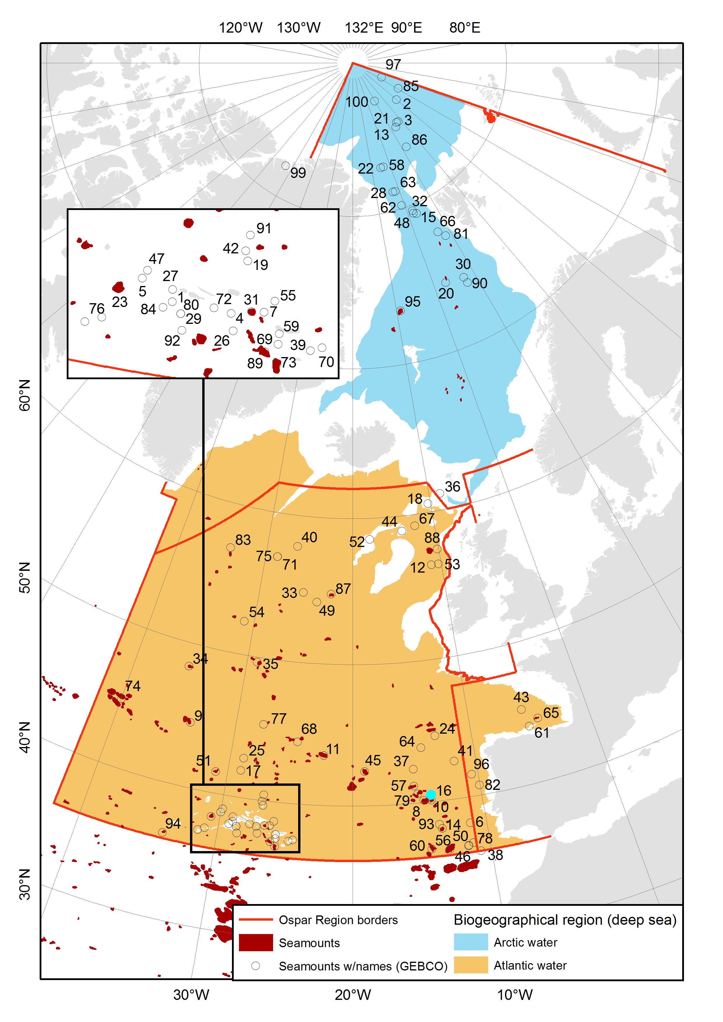 The global bathymetry model of Harris et al. (2014) predicts that 161 seamounts occurr within the OSPAR maritime area. Not all of these have been charted or studied, and the literature and bathymetry database review in this report resulted in a much shorter list of 100 seamounts or seamount-like features within the deep seas of OSPAR, i.e. regions I, IV and V. Published literature from the OSPAR area documented that there is knowledge of planktonic organisms for 11 seamounts, information on benthic species for 24 seamounts, and of fish from 16 seamounts. The best described component is the benthos with a total of 49 peer-reviewed papers.