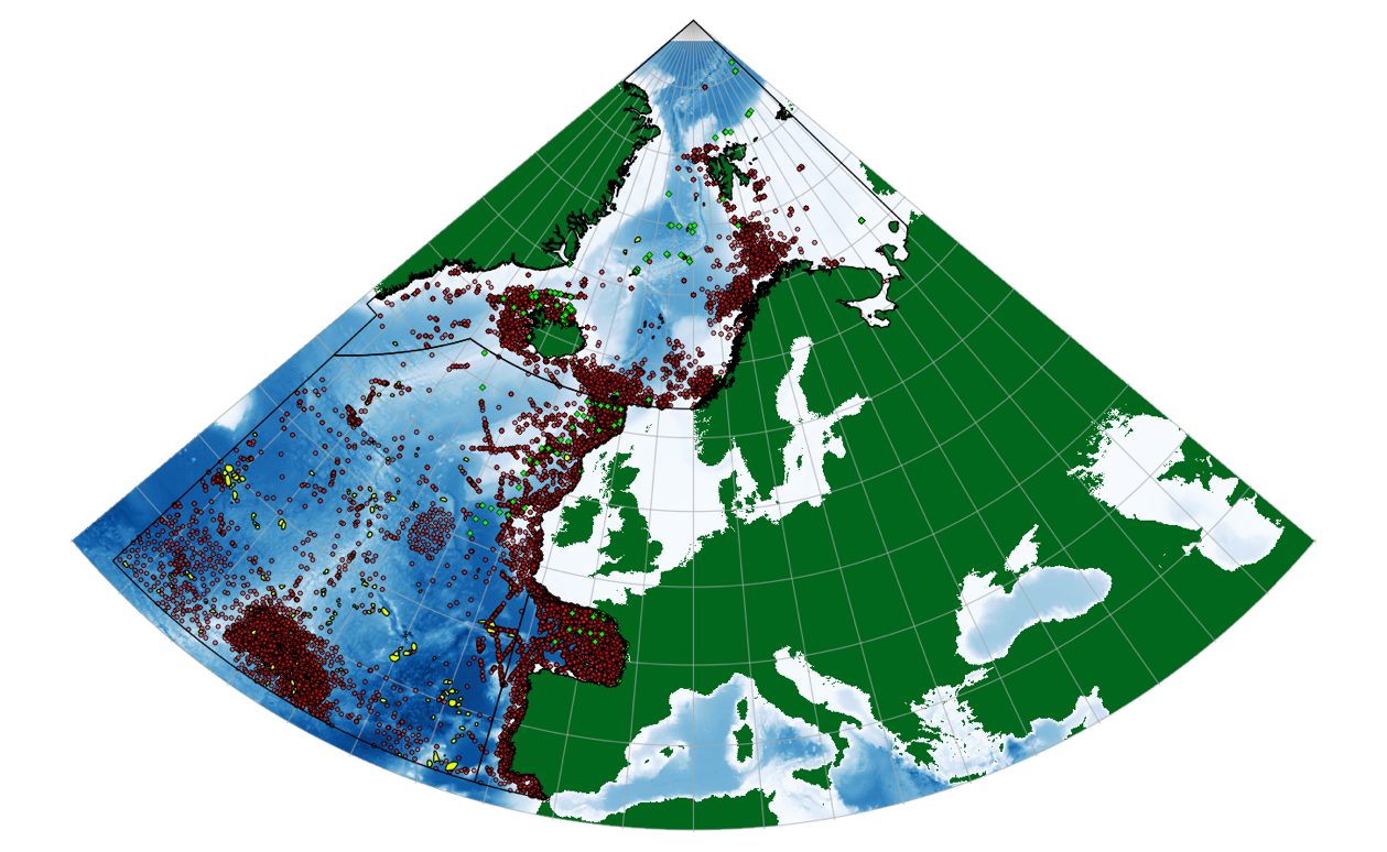The distribution of modelled seamounts (Figures 1 & 2) was extracted from the work of Harris et al. (2014) who used the SRTM30 PLUS global bathymetry grid (Becker et al. 2009) supplemented with the EMODnet (2013) data to create geomorphic feature maps of the world´s oceans. The work identified a total of 161 seamounts within the OSPAR maritime area. Within Region I (Arctic Waters) 16 seamounts covering a total area of 6 253 km2 were identified. Three of the seamounts lie within the North Atlantic deep-sea biogeographical province while the remaining 13 seamounts lie in the Arctic deep-sea subregion. Of the 16 seamounts situated in Region I, 61% belong to the group of small seamounts with deep peaks, while 39% belong to the group of intermediate seamounts.