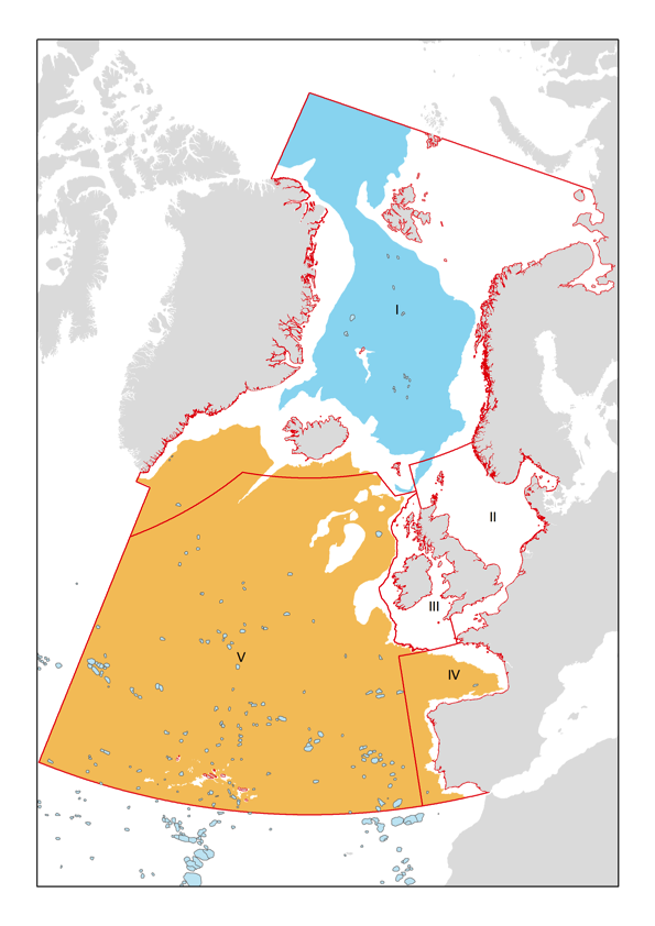 In 1992 the OSPAR Convention for the protection of the environment of the Northeast Atlantic was adopted, and since then the OSPAR Commission has been mandated to promote pertinent agreements and actions on behalf of the fifteen governments (Belgium, Denmark, Finland, France, Germany, Iceland, Ireland, Luxembourg, the Netherlands, Norway, Portugal, Spain, Sweden, Switzerland and United Kingdom) and the European Union. The OSPAR maritime area comprises approximately 13 500 000 km2 of the Atlantic Ocean and adjacent marginal seas and coastal zones with the boundaries defined by the OSPAR convention text (https://www.ospar.org/site/assets/files/1290/ospar_convention_e_updated_text_in_2007_no_revs.pdf). The maritime area is split into 5 regions (Figure 1). Below a brief characterization is provided of the geography, oceanography, biology and human activities in Regions I- Arctic Waters, IV- Bay of Biscay and Iberian Coast, and V- Wider Atlantic. These are the three OSPAR regions that have seamounts.