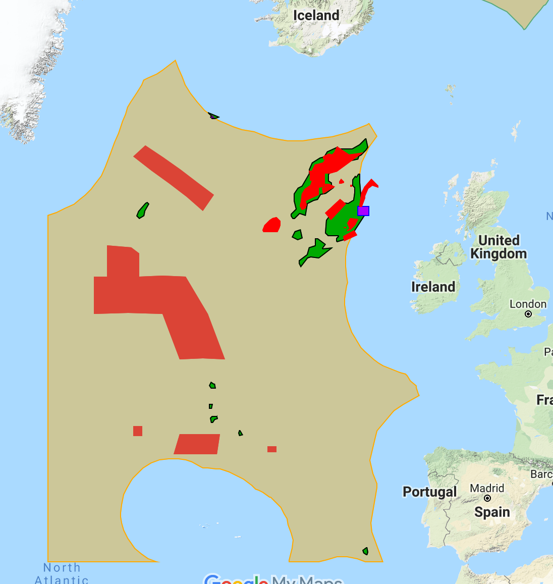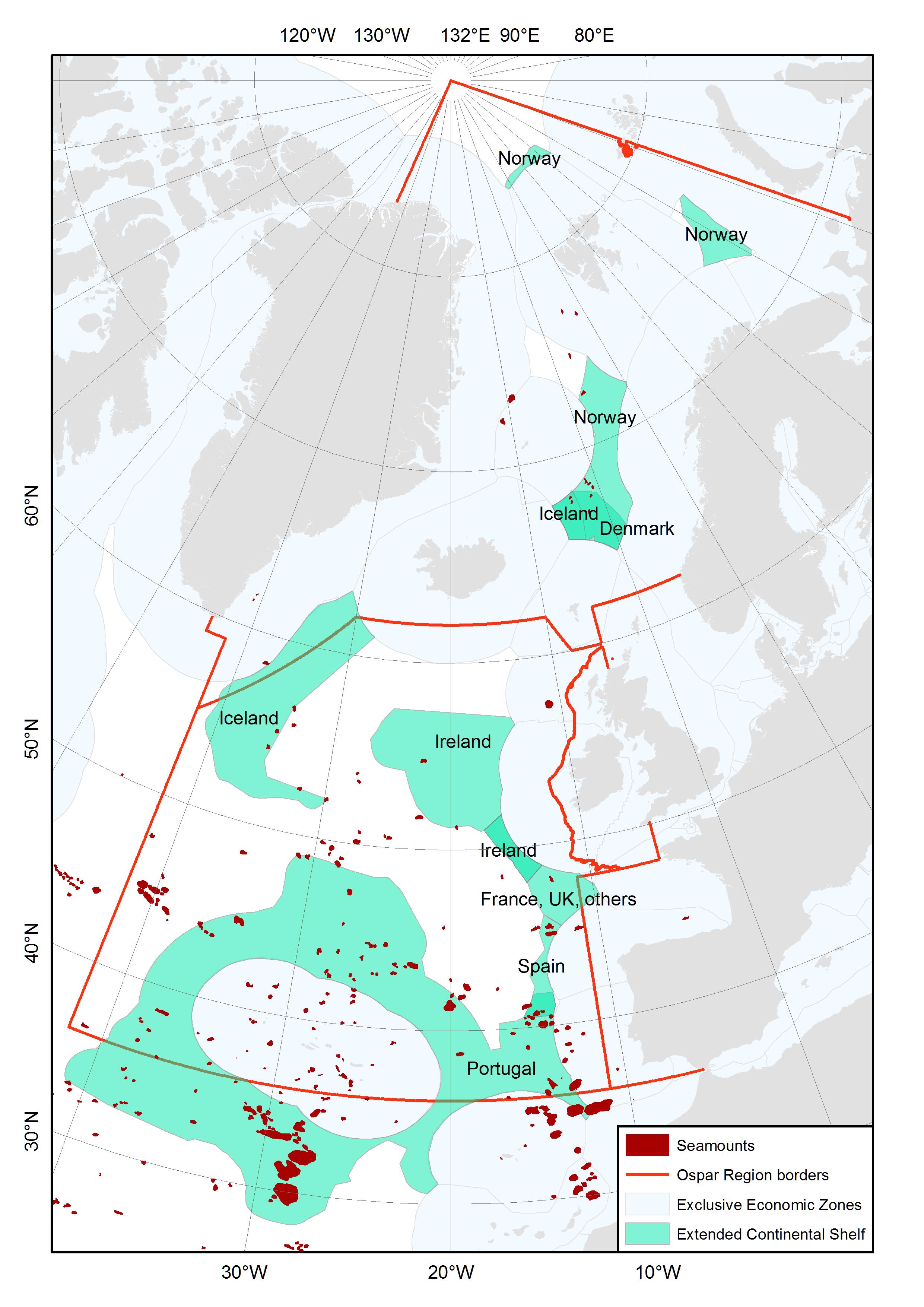 A minority of the modelled seamounts (i.e. 27%) lie within the Exclusive Economic Zones (EEZs) of the OSPAR member counties. Five seamounts are found within Norwegian EEZ, four in the Danish EEZ, three in the Spanish EEZ and 48 in the Portuguese EEZ. However, a majority of the seamounts (i.e. 66%) lie on the extended continental shelf (ECS) claim areas of OSPAR member counties (Figure 3), with e.g. 51 seamounts within the Portuguese ECS, 7 in the Icelandic ECS, and 5 in the Norwegian ECS.