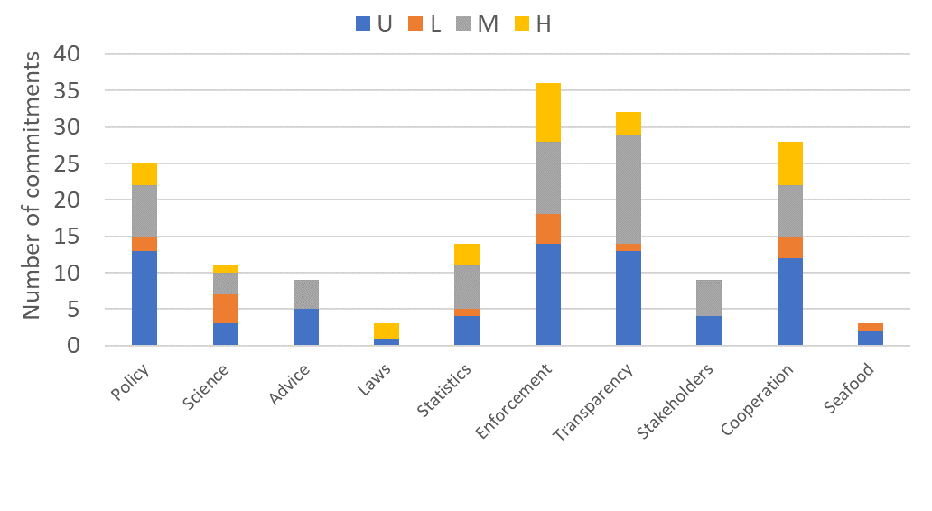 Many of the commitments that are evaluated to have medium or low impact are in components that by themselves may not lead to sustainable fisheries. For instance, science is a basic and important category, but if it is standing alone without political will to manage effectively or to enforce regulations, it may have little impact. The same goes for many of the other components that depend on a good interplay across categories to have significant effects on improved sustainability.