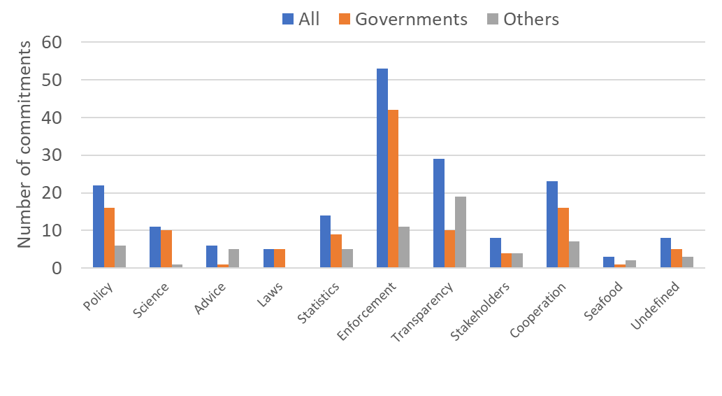 There are thirty-two commitments aiming at developing transparency in the management systems. Of these, fifteen were rated as having a medium level of impact on the communication while thirteen were rated as having an uncertain level of impact. Three were rated as having a high level of impact while one was rated as having low impact. Communication is important for a successful management regime and should have a high focus. The total number of commitments aiming at this component reflects a certain level of understanding of this fact. “Transparency” was the component that had the highest number of commitments among the ”Others” category of pledgers while for “Governments”, the “Enforcement” component received the highest number of commitments (Figure 6). This topic is clearly seen as a challenge in many places.