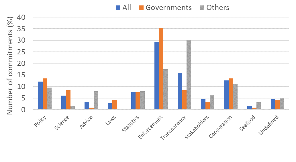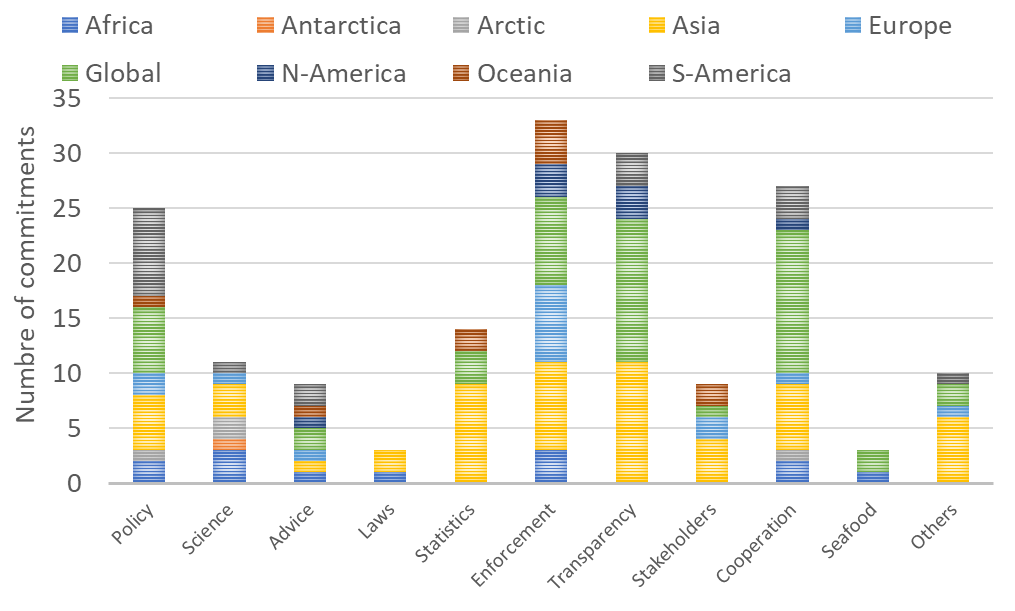 Part of the task given by the Ministry of Foreign Affairs was to categorise the commitments. Sustainable fisheries depend on coordinated efforts between science, management and the industry. Based on our experience and best practice in fisheries management (see FAO, 1995; FAO, 1997; Gullestad et al., 2013) we developed a list of ten components that are important to achieve sustainable fisheries (Table 2). We then categorised the 182 commitments accordingly. Most commitments were relatively focused and therefore easy to assign to a particular component. Some were of a more diffuse or multi-purpose nature and were categorised according to what we assumed to be the major purpose of the commitment. A few commitments were grouped as “Undefined” as they were not considered to be supportive of sustainable fisheries (e.g. commitments to aquaculture).