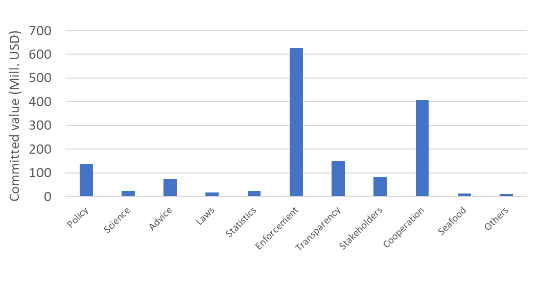 In a global perspective, the Our Ocean commitments are significant, but still limited compared to the overall efforts in this topic. It is therefore important that the Our Ocean commitments are aligned with ongoing initiatives and efforts, to create synergies and reinforce the implementation of initiatives addressing the ten components that are key to achieve sustainable fisheries. A more harmonised approach with an objective gap analysis of which components are missing the most in the fisheries management system, would have been a good starting point for more systematic approach to providing commitments. We suggest that this is considered in future Our Ocean conferences.
