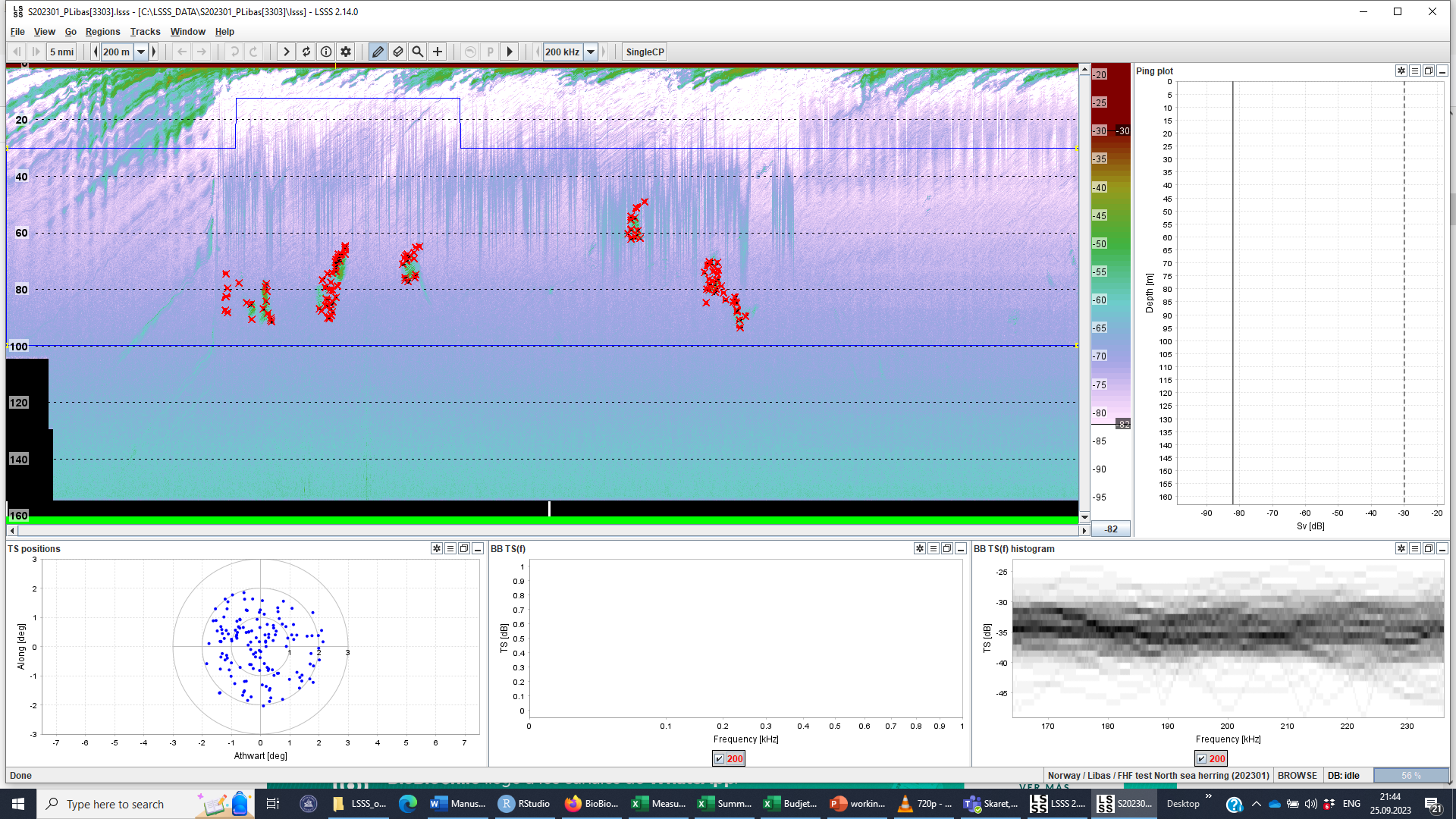 Echosounder data was scrutinized using post processing system LSSS (Korneliussen et al., 2018) and ad-hoc Application Programing Interface (API) functions created to extract targets properties. The scrutinizing process included the manual identification of well-defined single fish tracks in absence of an automatic school tracking for broadband data implemented in LSSS. A sample of the fish tracks in the school were exported and analyzed, selecting those with a close to normal incidence angle ( ca . 90 deg) to the echosounder beam.